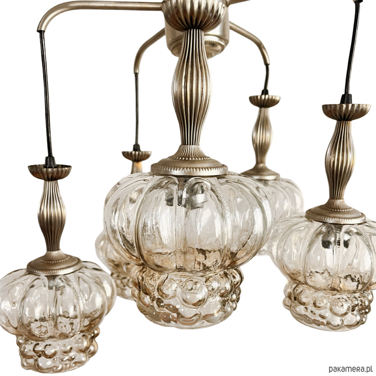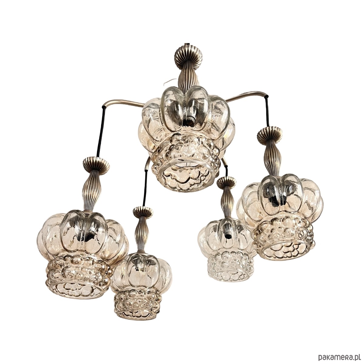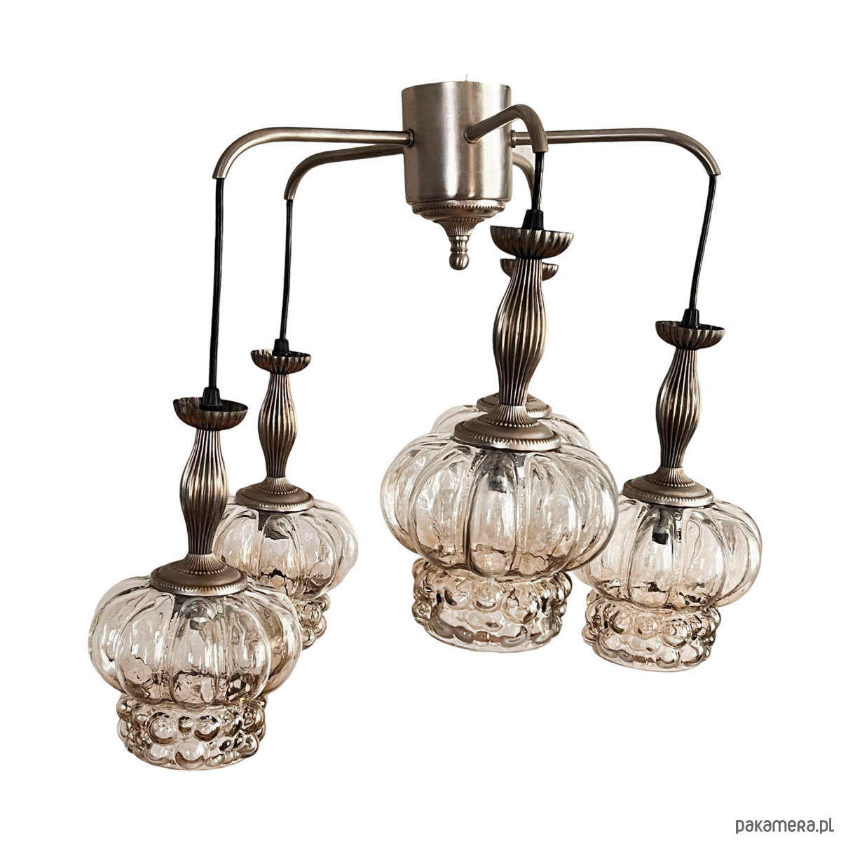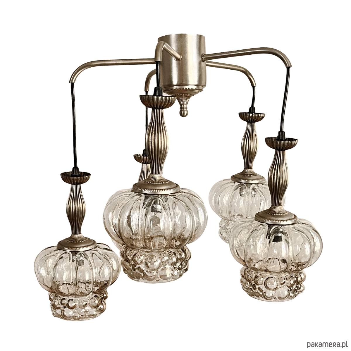 Kaskadowy żyrandol w stylu Mid-Century Modern z elementami space age wyprodukowany w Niemczech na przełomie lata 70. i 80. przez VEB Narva Leuchtenbau Lengefeld. Lampa składa się z 5 podwieszonych punktów świetlnych, klosze za szkła prasowanego, zostały podwieszone na kablach w kolorze czanym, podsufitka mocowania, podsufitka i wykończenie wykonane z metalu. Lampa na 5 żarówek o małym gwincie E14 do 60 W. Stan lampy oceniamy na bardzo dobry, nosi niewielkie ślady użytkowania.