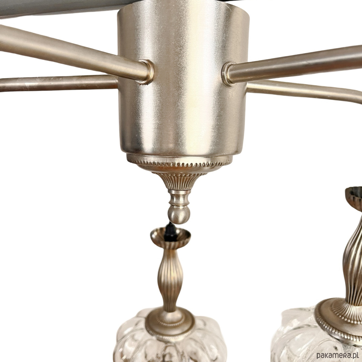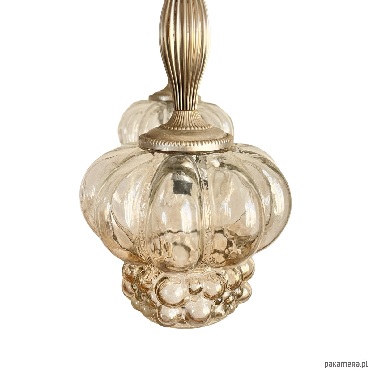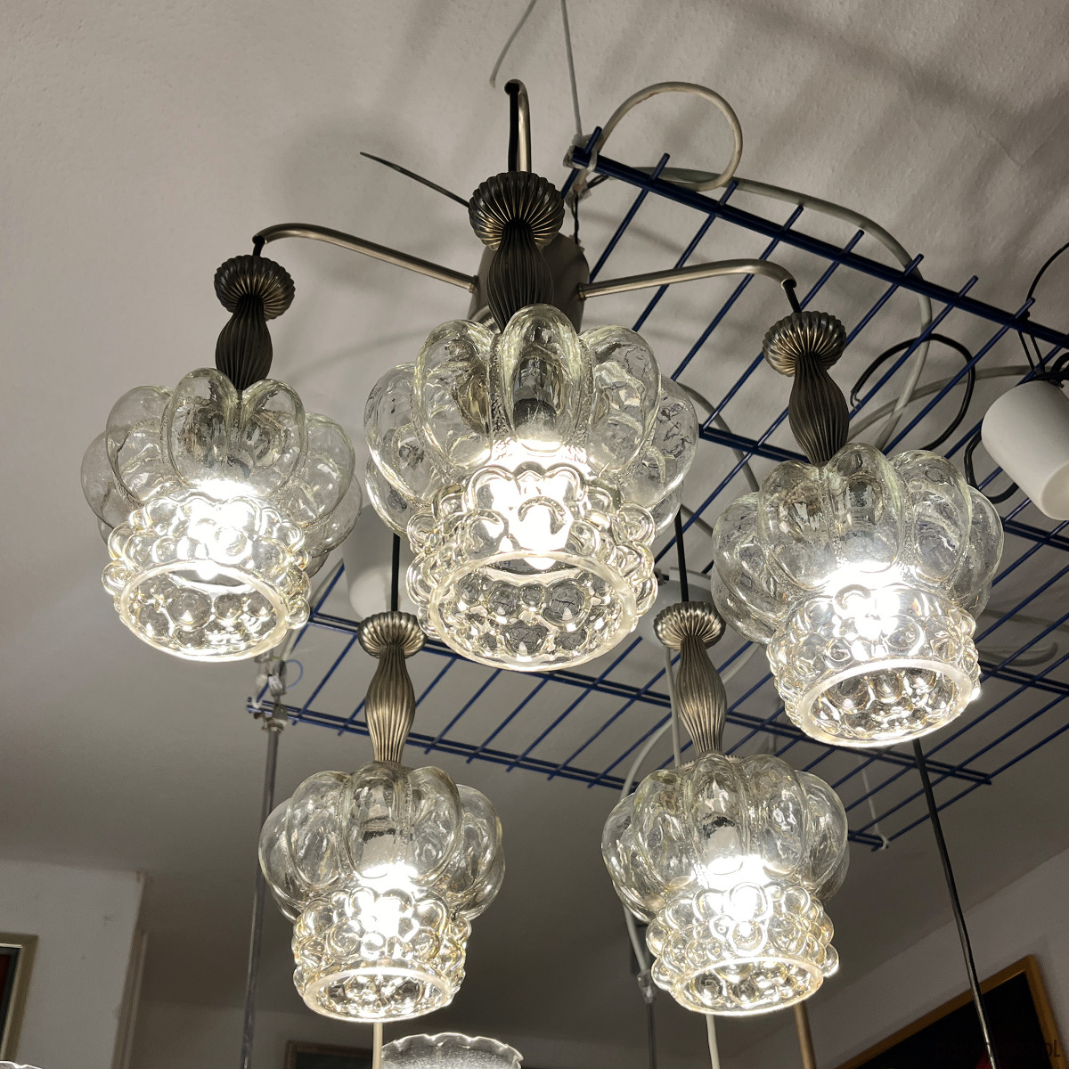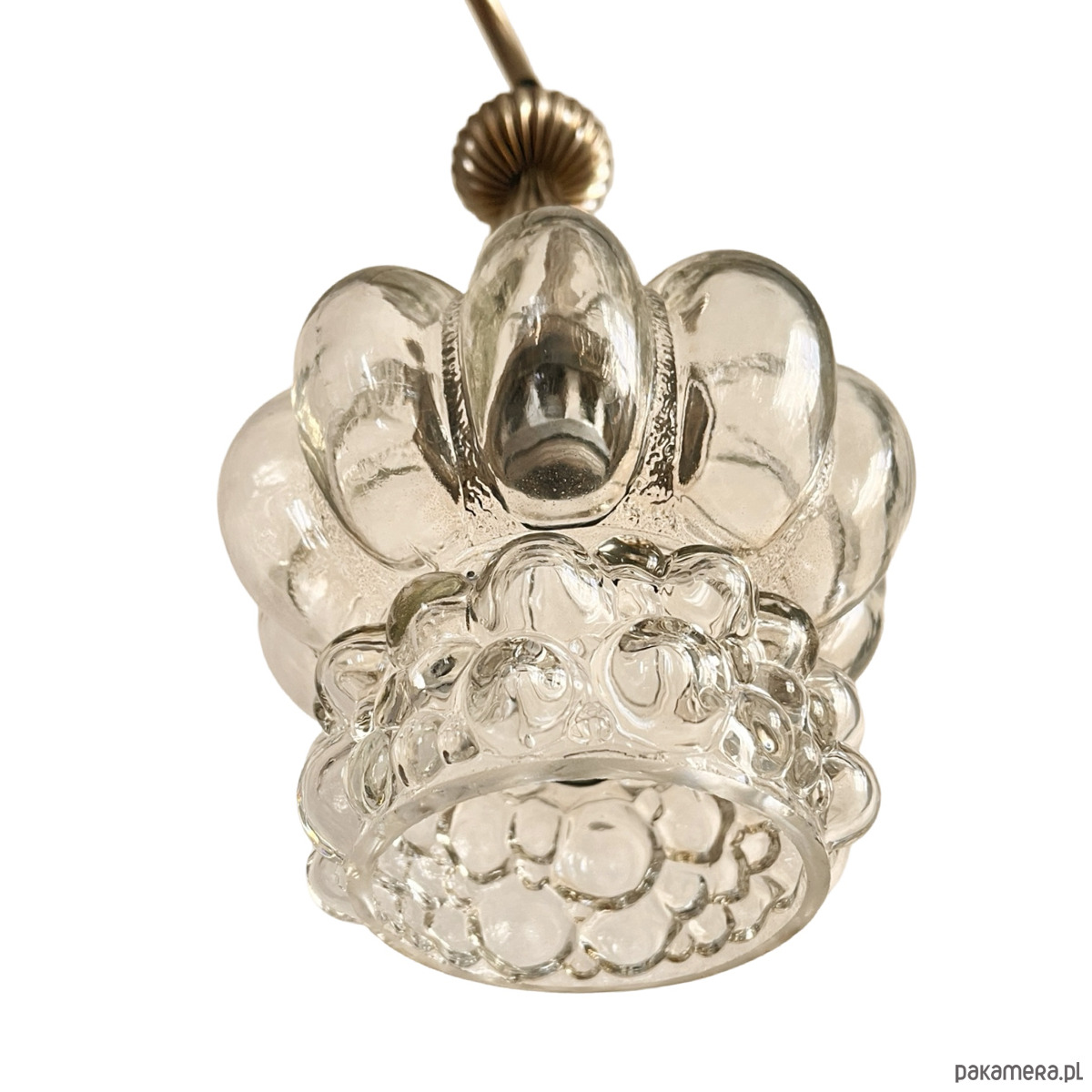 Kaskadowy żyrandol w stylu Mid-Century Modern z elementami space age wyprodukowany w Niemczech na przełomie lata 70. i 80. przez VEB Narva Leuchtenbau Lengefeld. Lampa składa się z 5 podwieszonych punktów świetlnych, klosze za szkła prasowanego, zostały podwieszone na kablach w kolorze czanym, podsufitka mocowania, podsufitka i wykończenie wykonane z metalu. Lampa na 5 żarówek o małym gwincie E14 do 60 W. Stan lampy oceniamy na bardzo dobry, nosi niewielkie ślady użytkowania.