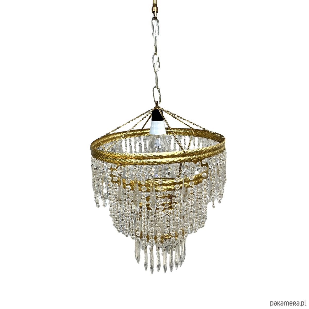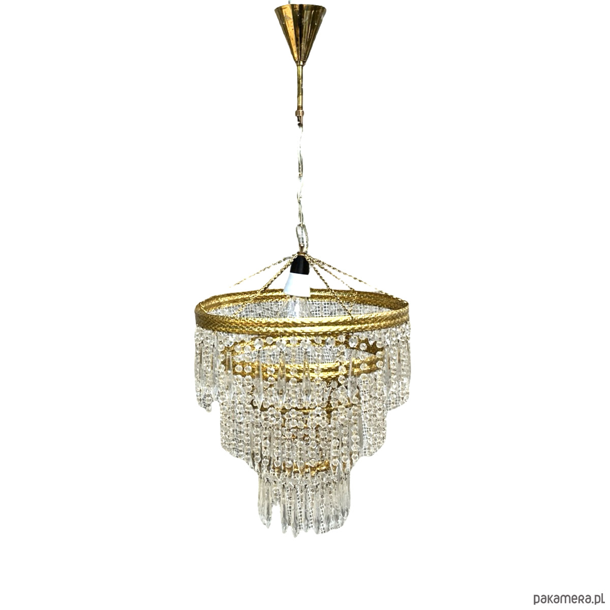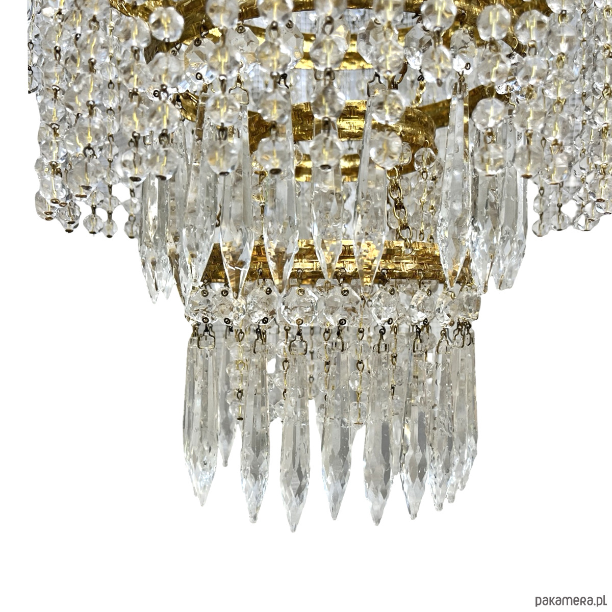 Lampa wykonana z mosiężnej konstrukcji ozdobionej szeregiem szklanych, kryształowych koralików i sopli, tworzących efektowną, kaskadową formę. Światło pięknie załamuje się w szkle, podkreślając wyjątkowy charakter żyrandola i nadając wnętrzu atmosferę luksusu.