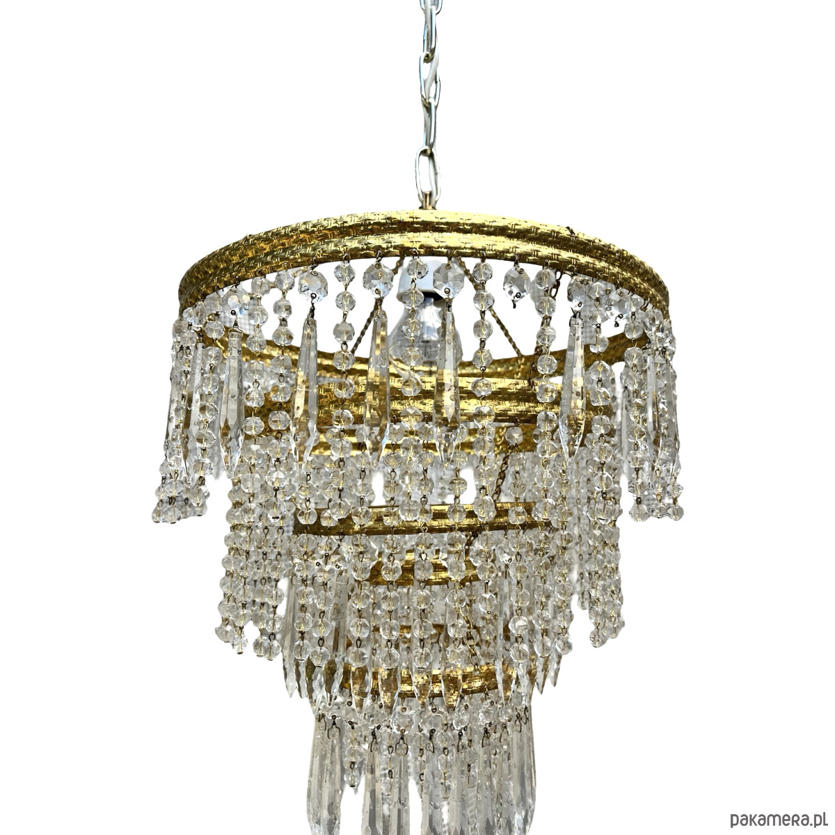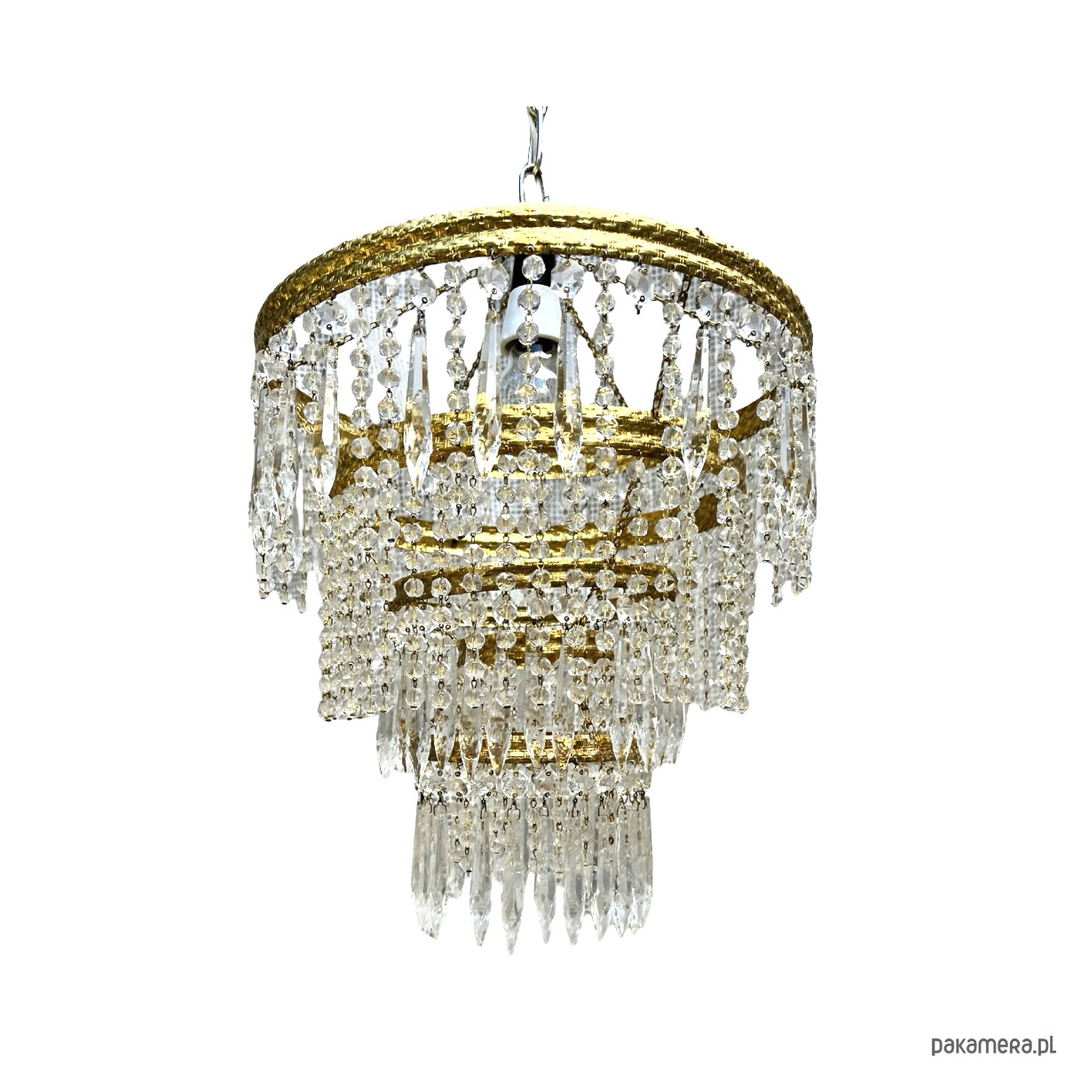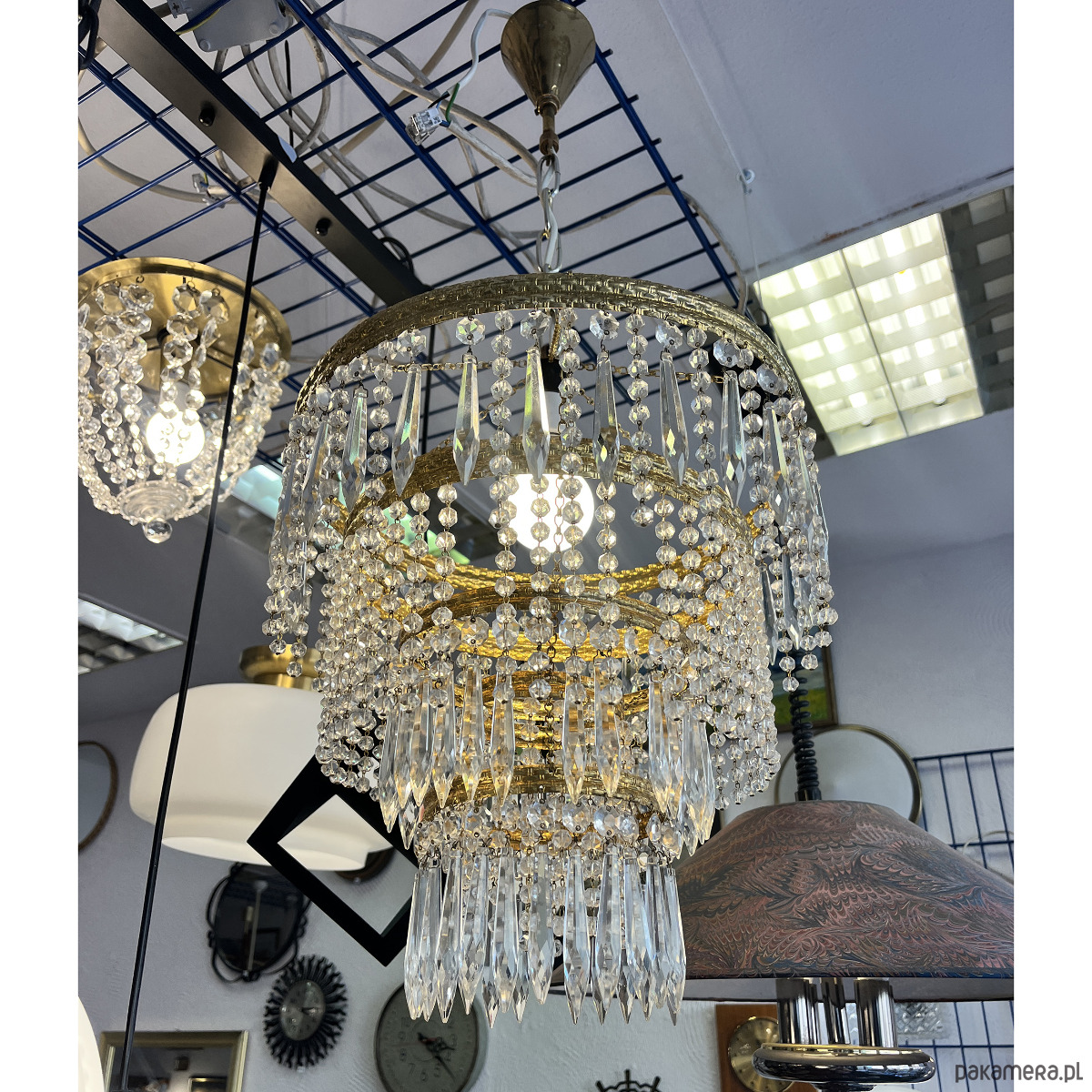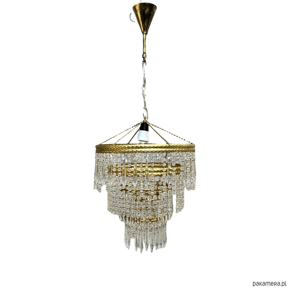 Lampa wykonana z mosiężnej konstrukcji ozdobionej szeregiem szklanych, kryształowych koralików i sopli, tworzących efektowną, kaskadową formę. Światło pięknie załamuje się w szkle, podkreślając wyjątkowy charakter żyrandola i nadając wnętrzu atmosferę luksusu.