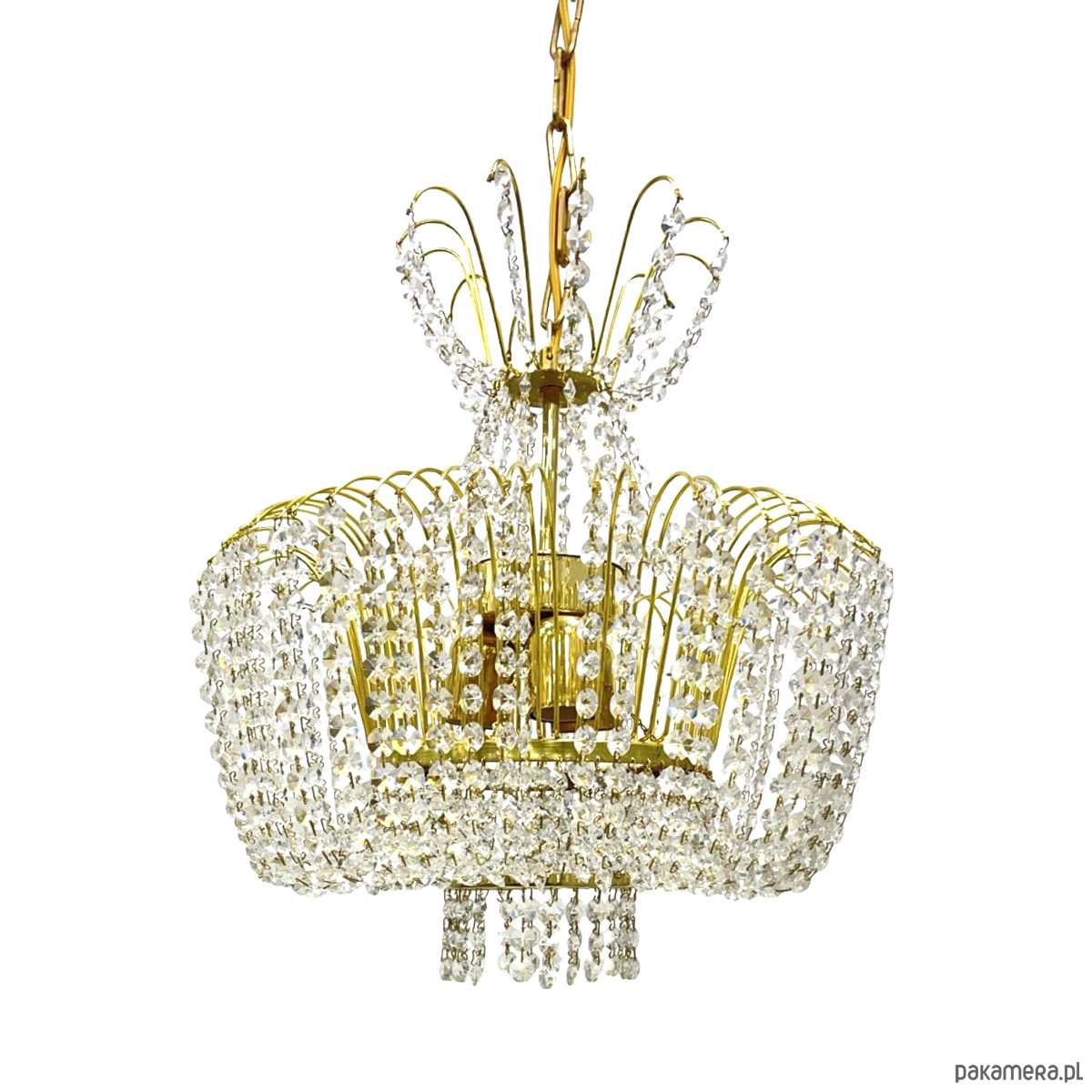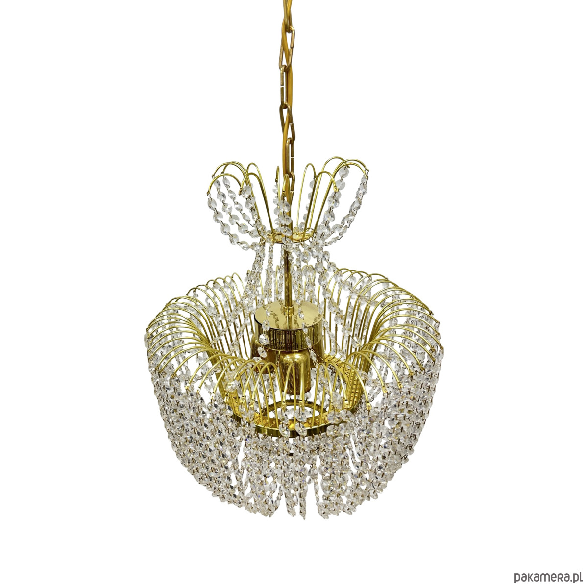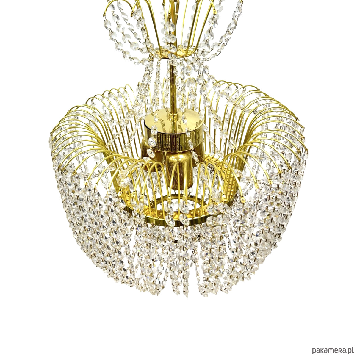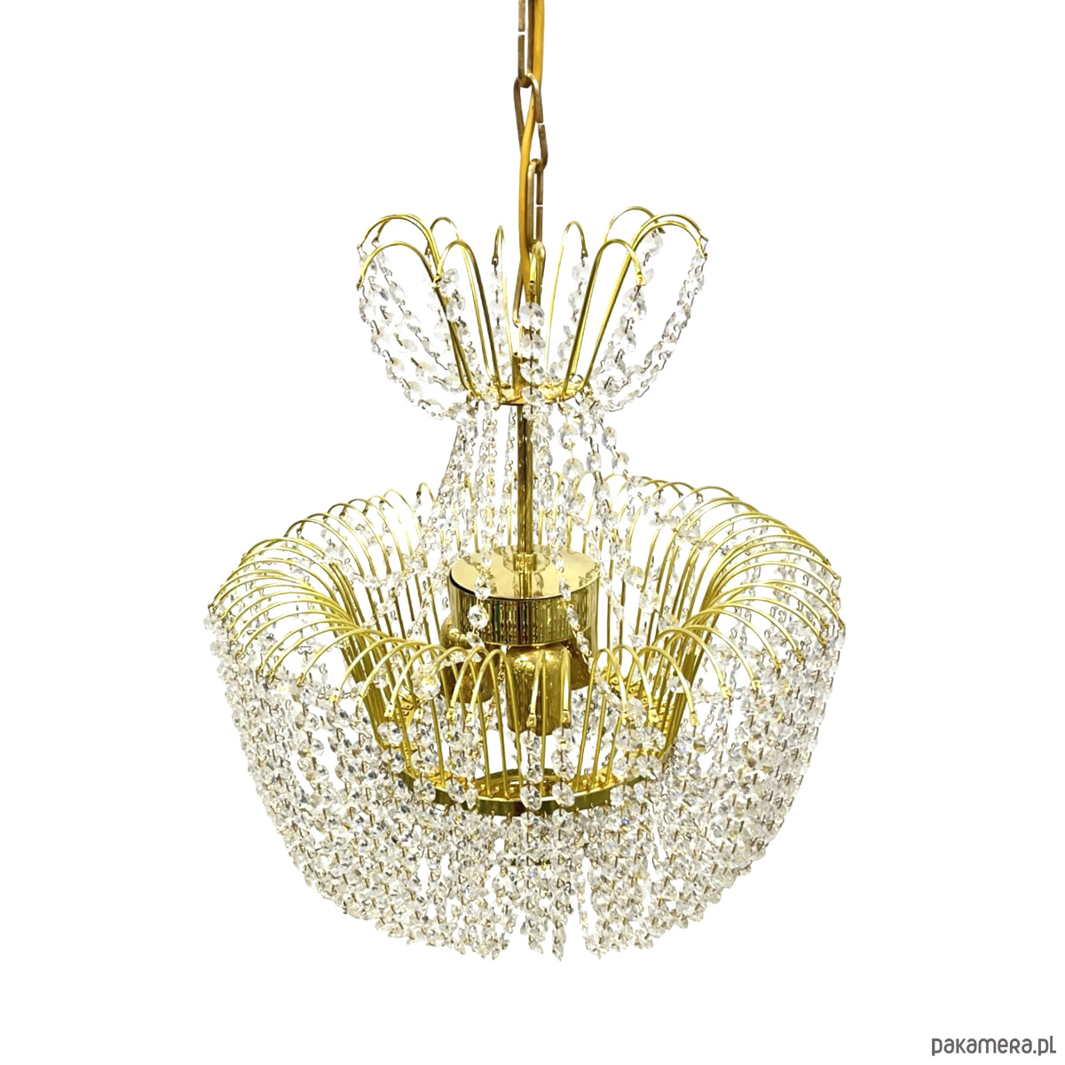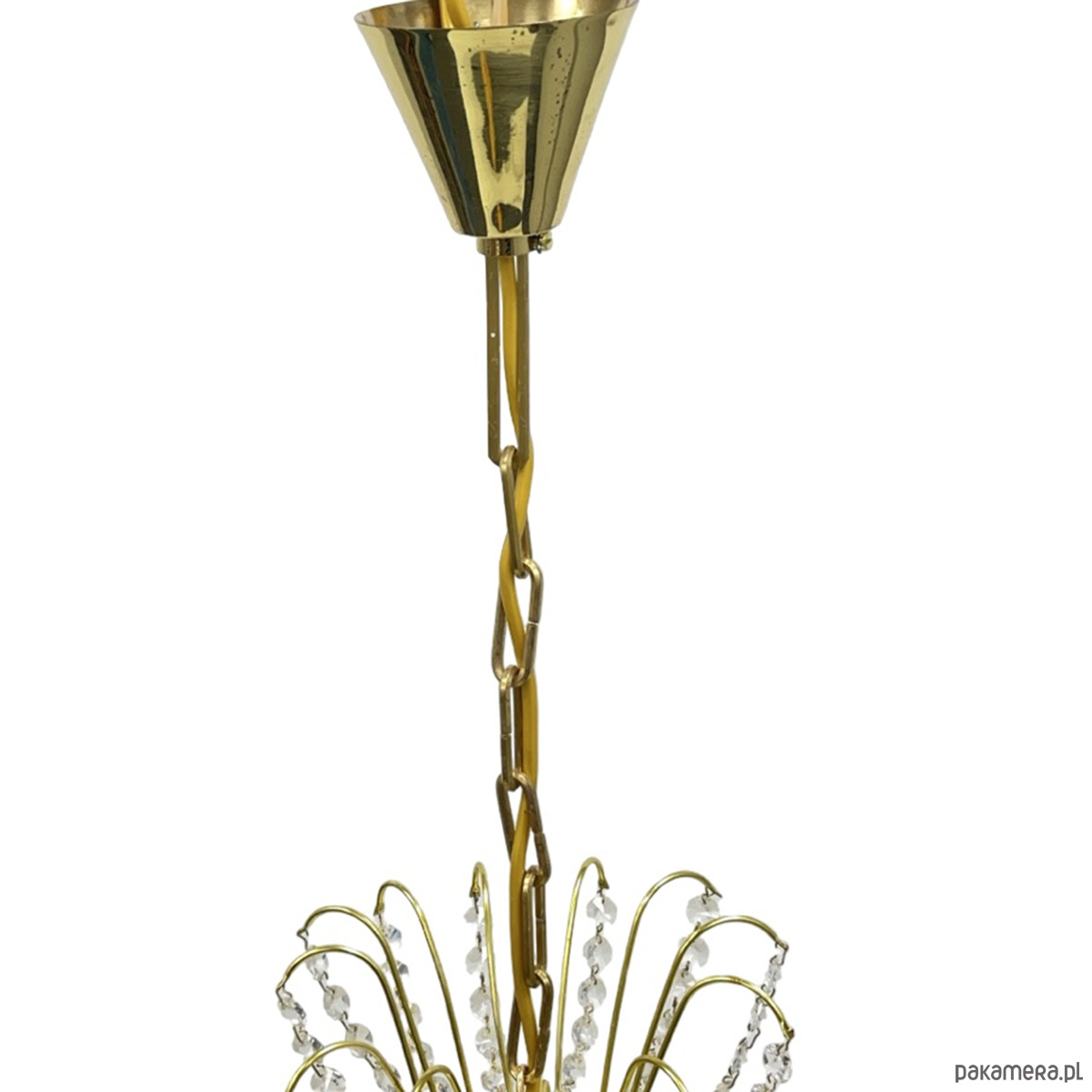 Żyrandol kryształowy Kamenický Šenov — mosiądz złocony, kryształy szlifowane (kryształ szklisty), 6 oprawek żarówkowych E14. Konstrukcja w formie dwupoziomowej kaskady: górna część z promieniście rozmieszczonych łuków mosiężnych z zawieszonymi girlandami kryształowymi, środkowa część w kształcie kosza z gęstą kurtyną kryształowych łańcuszków, dolna część z okrągłym zwieńczeniem kryształowym. Stelaż z mosiądzu w kolorze złotym, kryształy przezroczyste, szlifowane, łamią światło tworząc efektowne refleksy. Kamenický Šenov (Kamenný Šenov, niem. Steinschönau) to historyczne centrum produkcji szkła i kryształów w północnych Czechach, słynące z najwyższej jakości wyrobów szklarskich i kryształowych od XVIII wieku. Wymiary: wysokość 78 cm, średnica 58 cm. Czechosłowacja, lata 60./70. XX w. Stan bardzo dobry, kompletny.