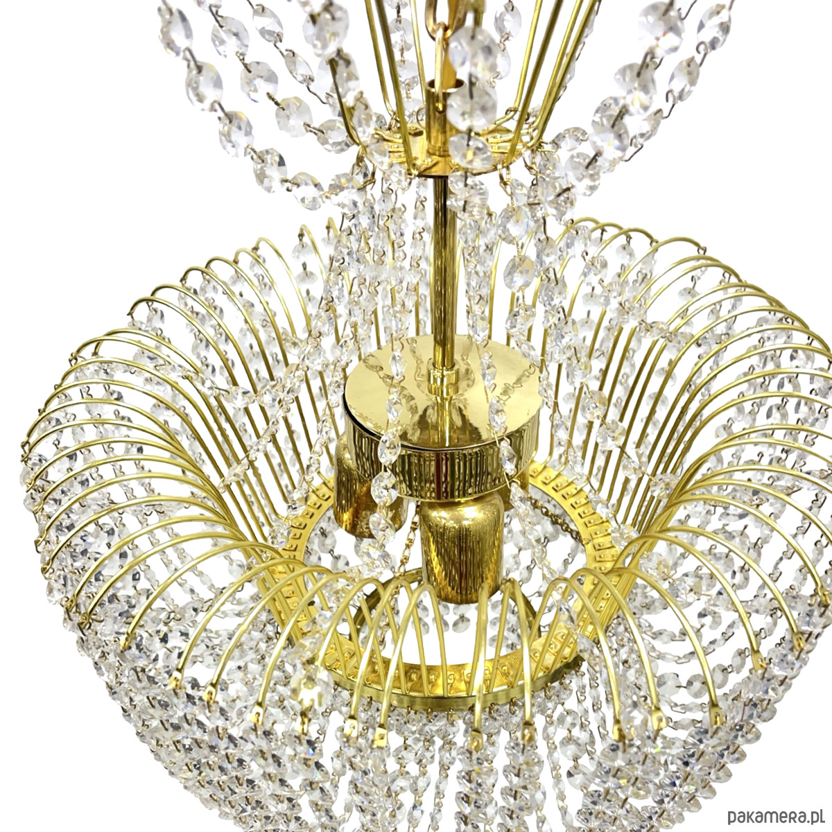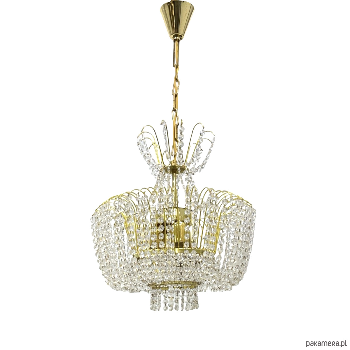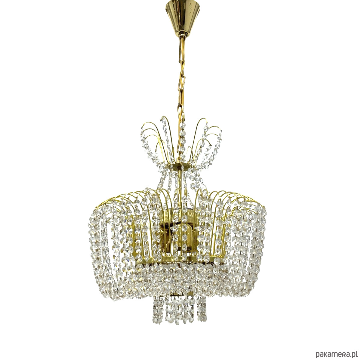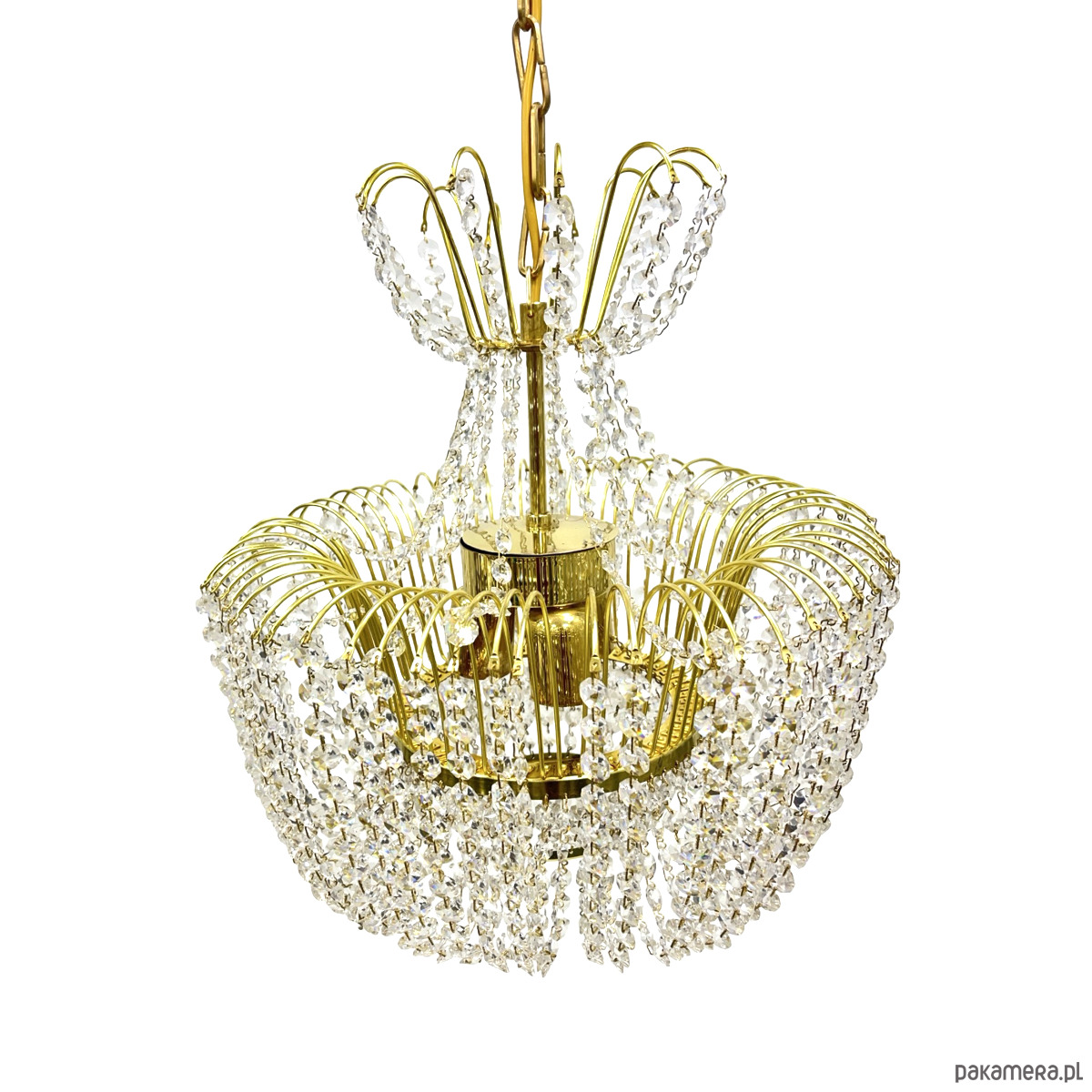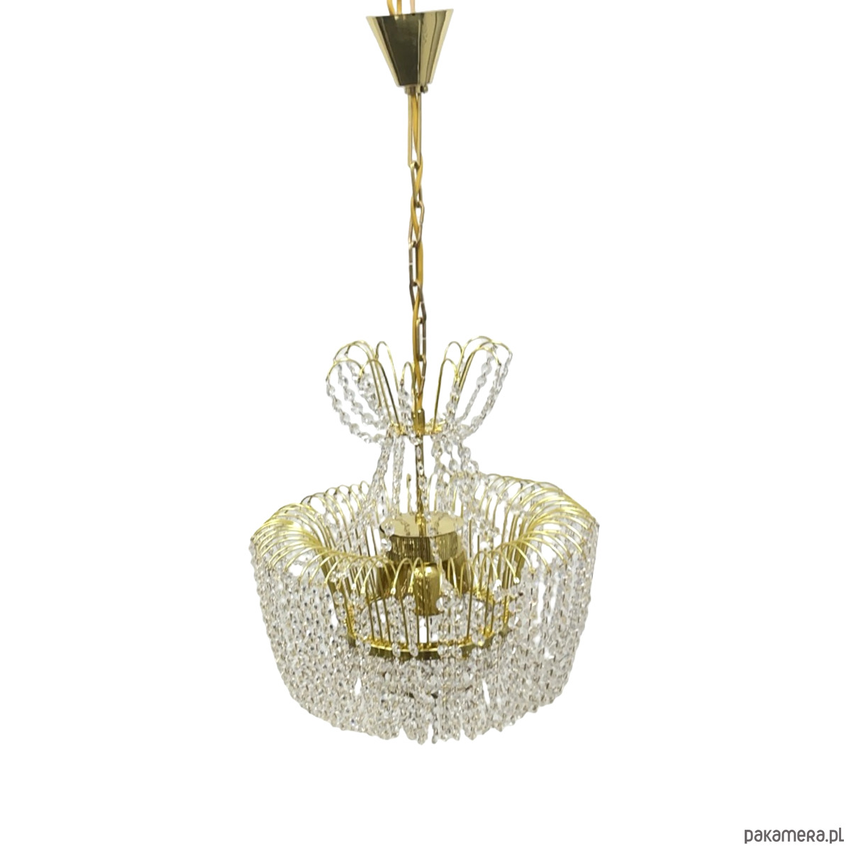 Żyrandol kryształowy Kamenický Šenov — mosiądz złocony, kryształy szlifowane (kryształ szklisty), 6 oprawek żarówkowych E14. Konstrukcja w formie dwupoziomowej kaskady: górna część z promieniście rozmieszczonych łuków mosiężnych z zawieszonymi girlandami kryształowymi, środkowa część w kształcie kosza z gęstą kurtyną kryształowych łańcuszków, dolna część z okrągłym zwieńczeniem kryształowym. Stelaż z mosiądzu w kolorze złotym, kryształy przezroczyste, szlifowane, łamią światło tworząc efektowne refleksy. Kamenický Šenov (Kamenný Šenov, niem. Steinschönau) to historyczne centrum produkcji szkła i kryształów w północnych Czechach, słynące z najwyższej jakości wyrobów szklarskich i kryształowych od XVIII wieku. Wymiary: wysokość 78 cm, średnica 58 cm. Czechosłowacja, lata 60./70. XX w. Stan bardzo dobry, kompletny.