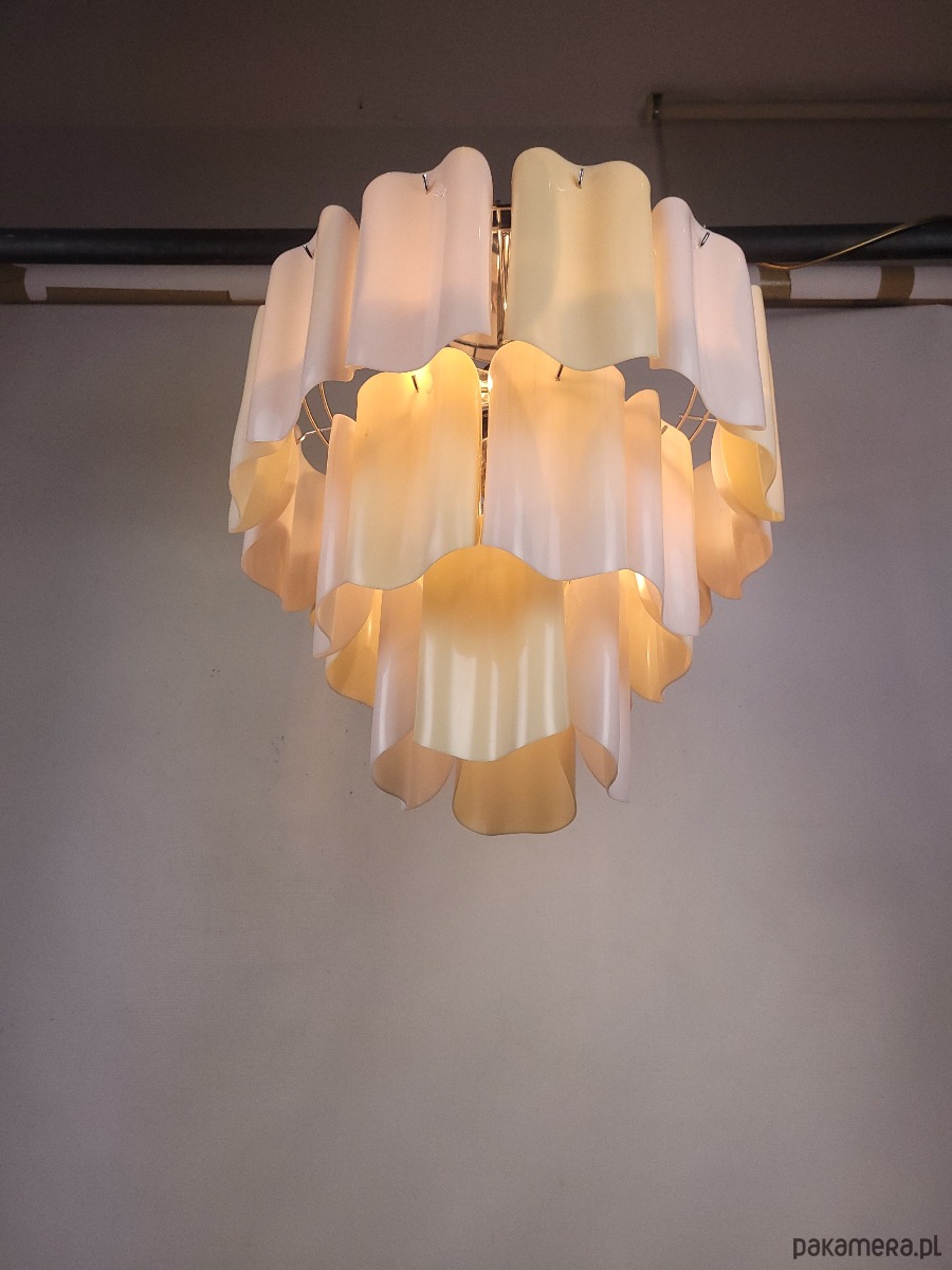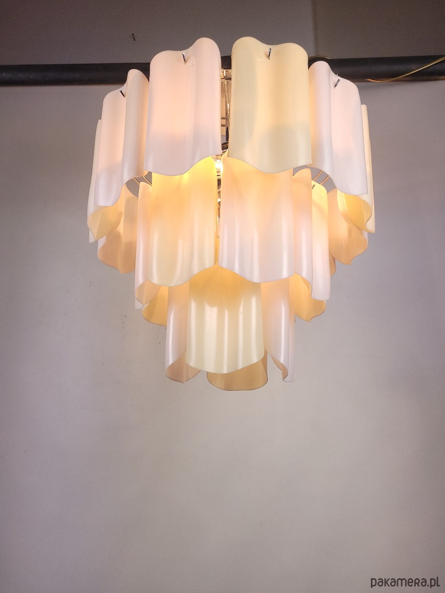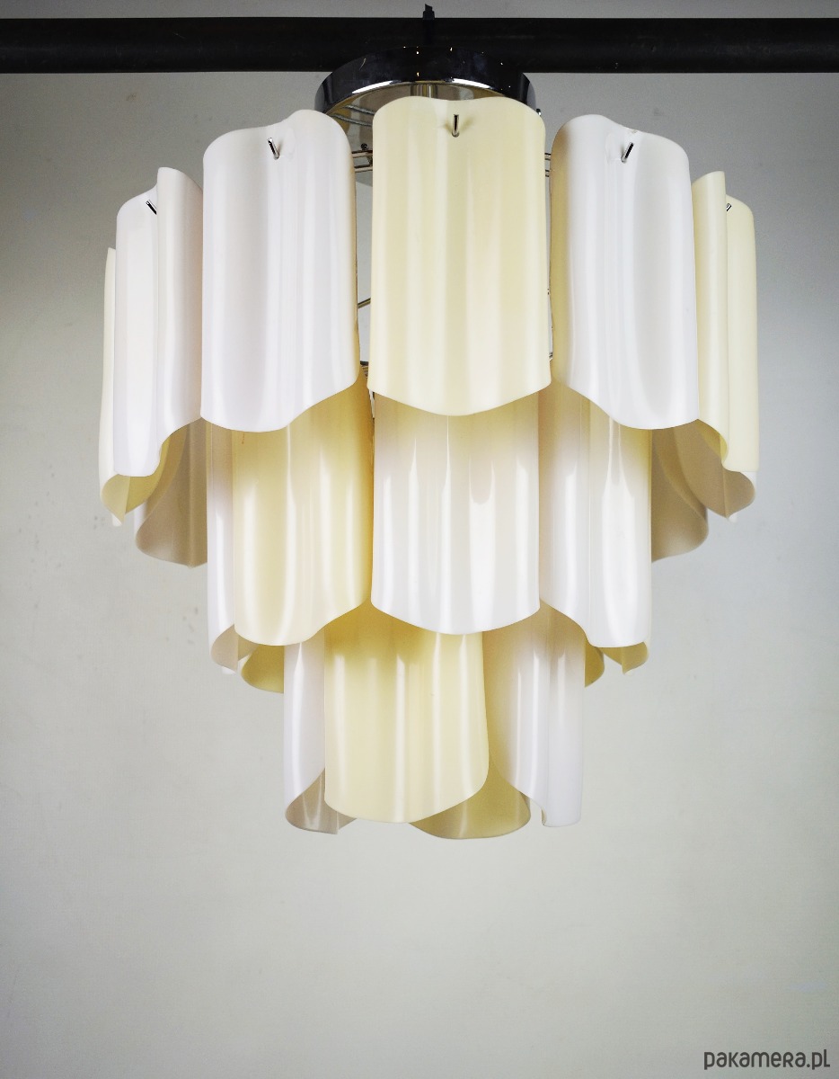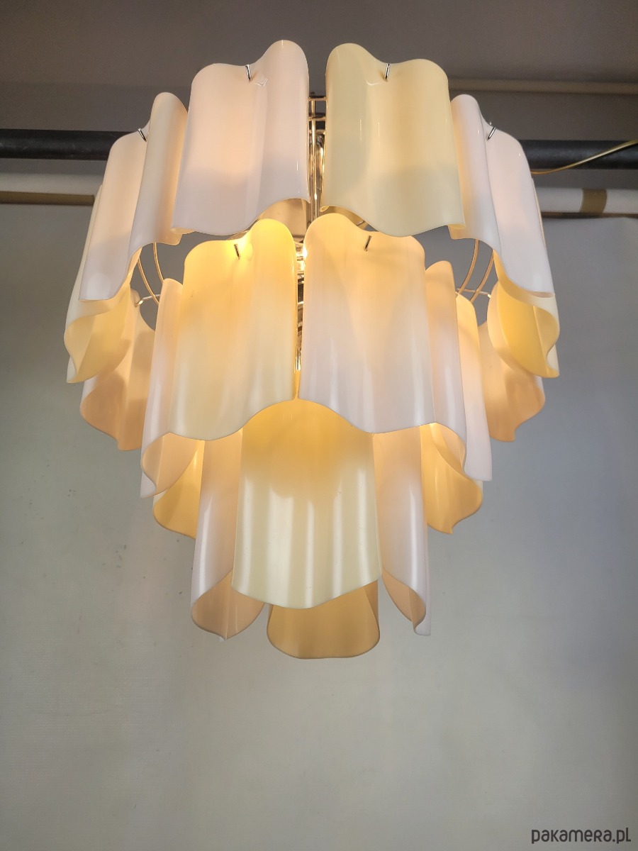 Żyrandol pochodzący z Włoch, z lat 80, wykonany z ręcznie formowanego tworzywa. Lampa posiada delikatne ślady czasu.