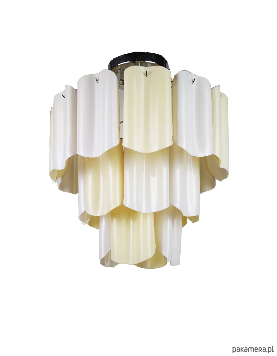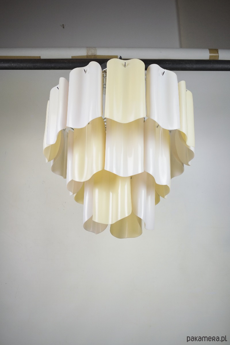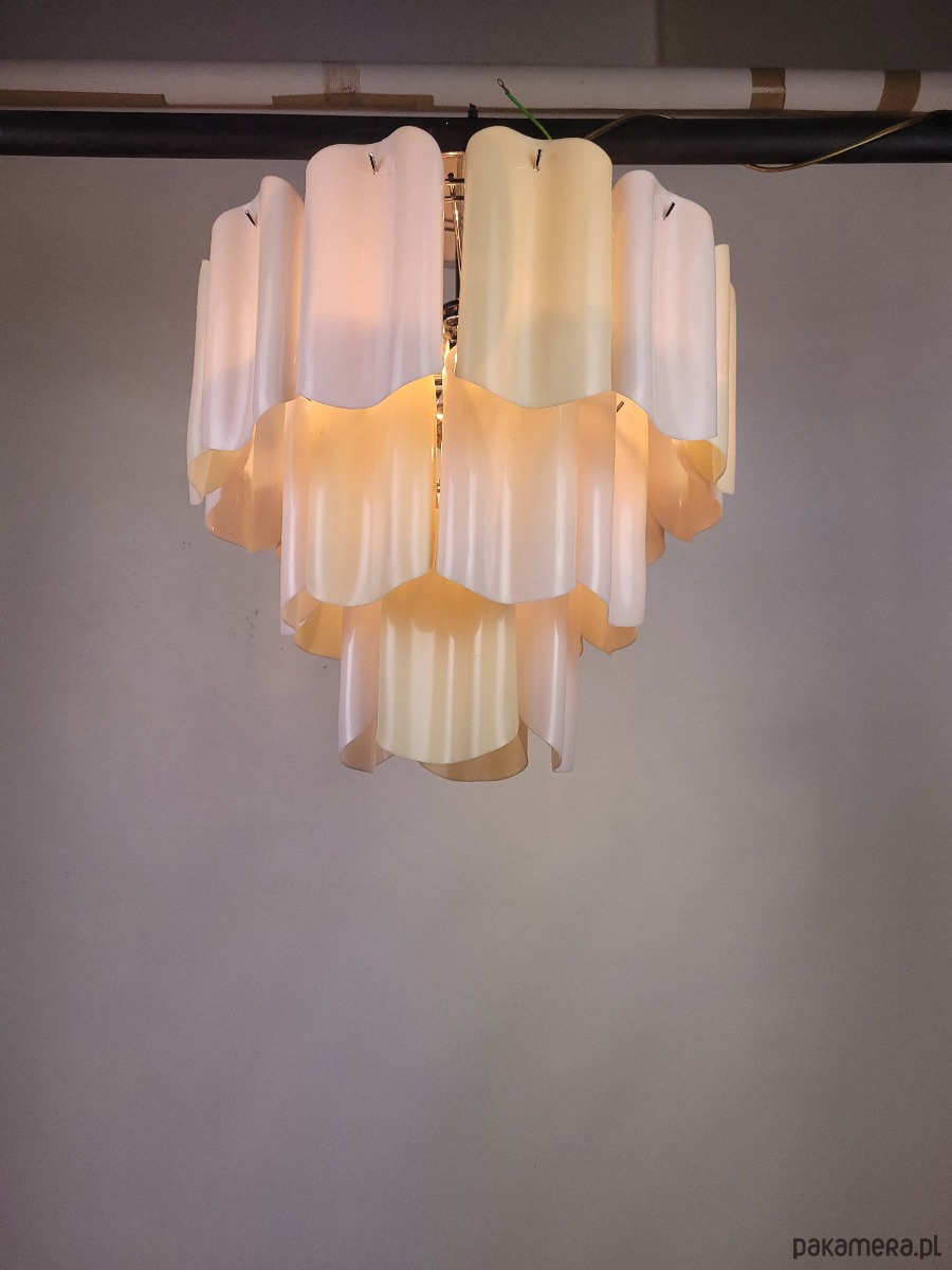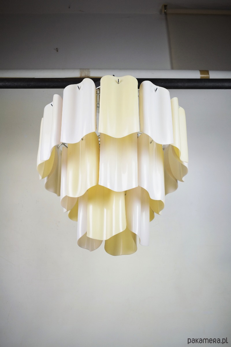 Żyrandol pochodzący z Włoch, z lat 80, wykonany z ręcznie formowanego tworzywa. Lampa posiada delikatne ślady czasu.