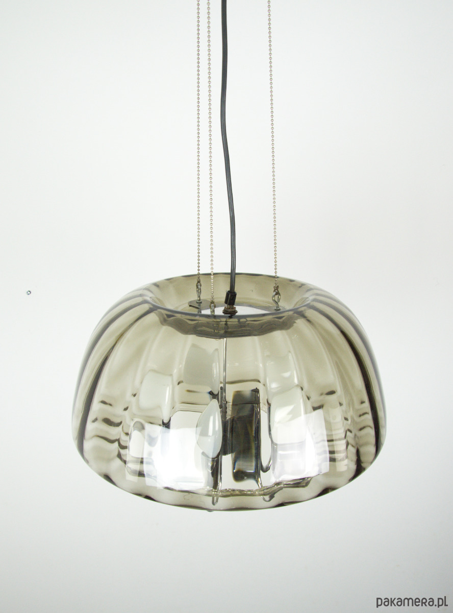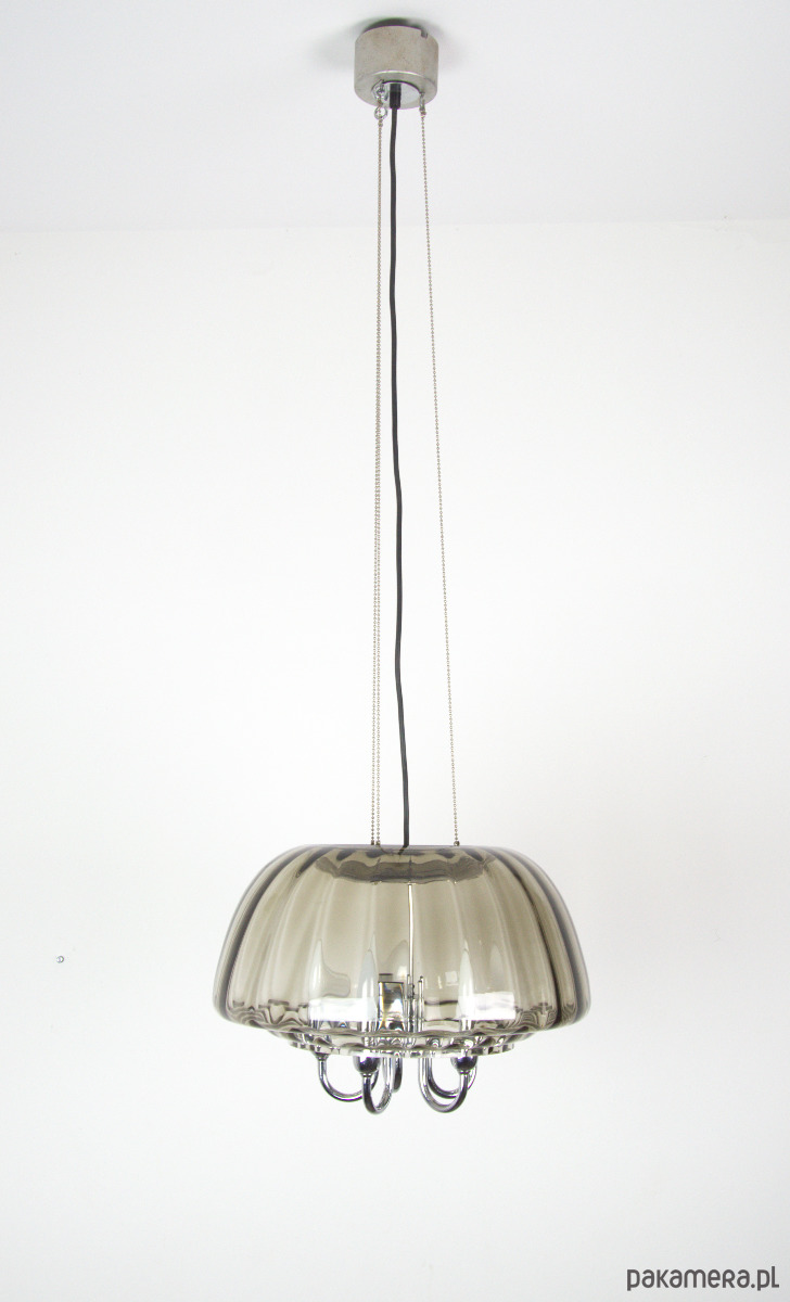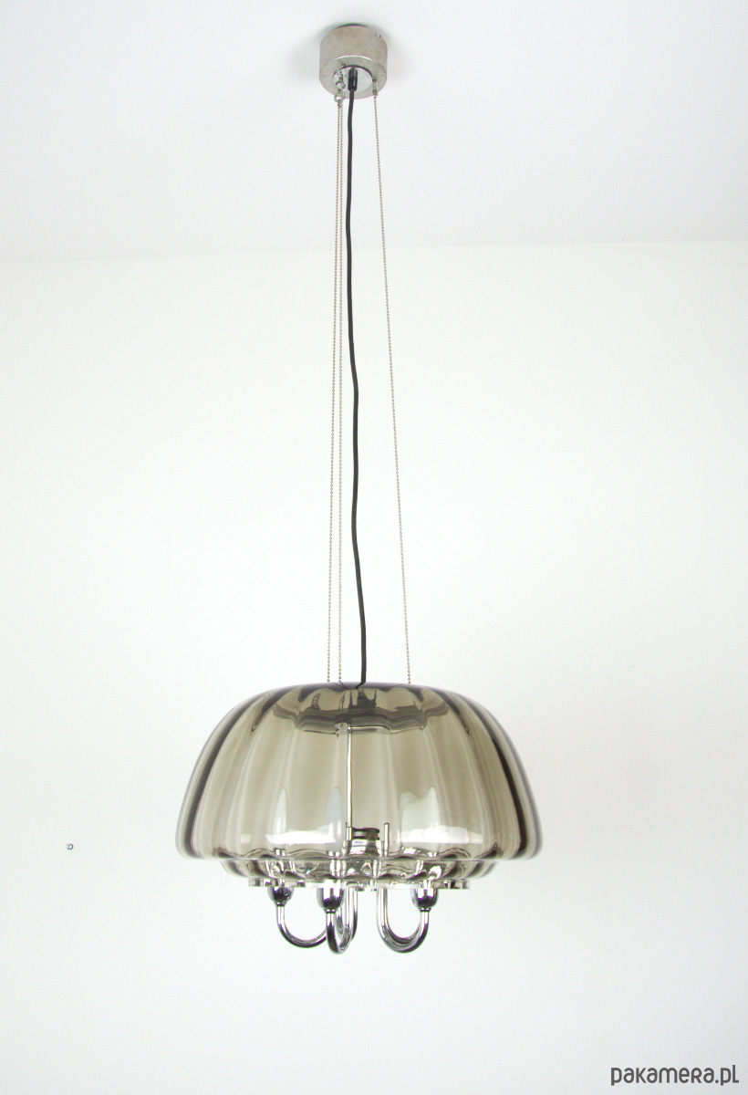 Duży żyrandol Limburg wykonany z dymionego szkła w latach 70. Dodatkwo klosz zabezpieczony przez trzy łańcuszki zamocowane do podsufitki. Pięć punktów świetlnych z oprawkami na żarówki E14. Stan lampy bardzo dobry, delikatnie odbarwiona podsufitka.