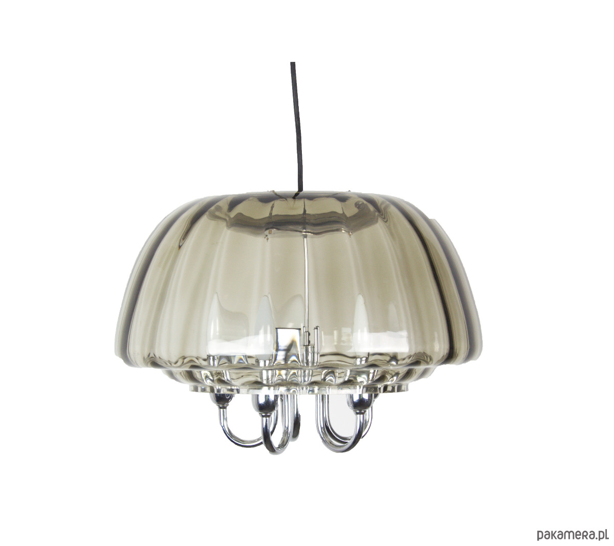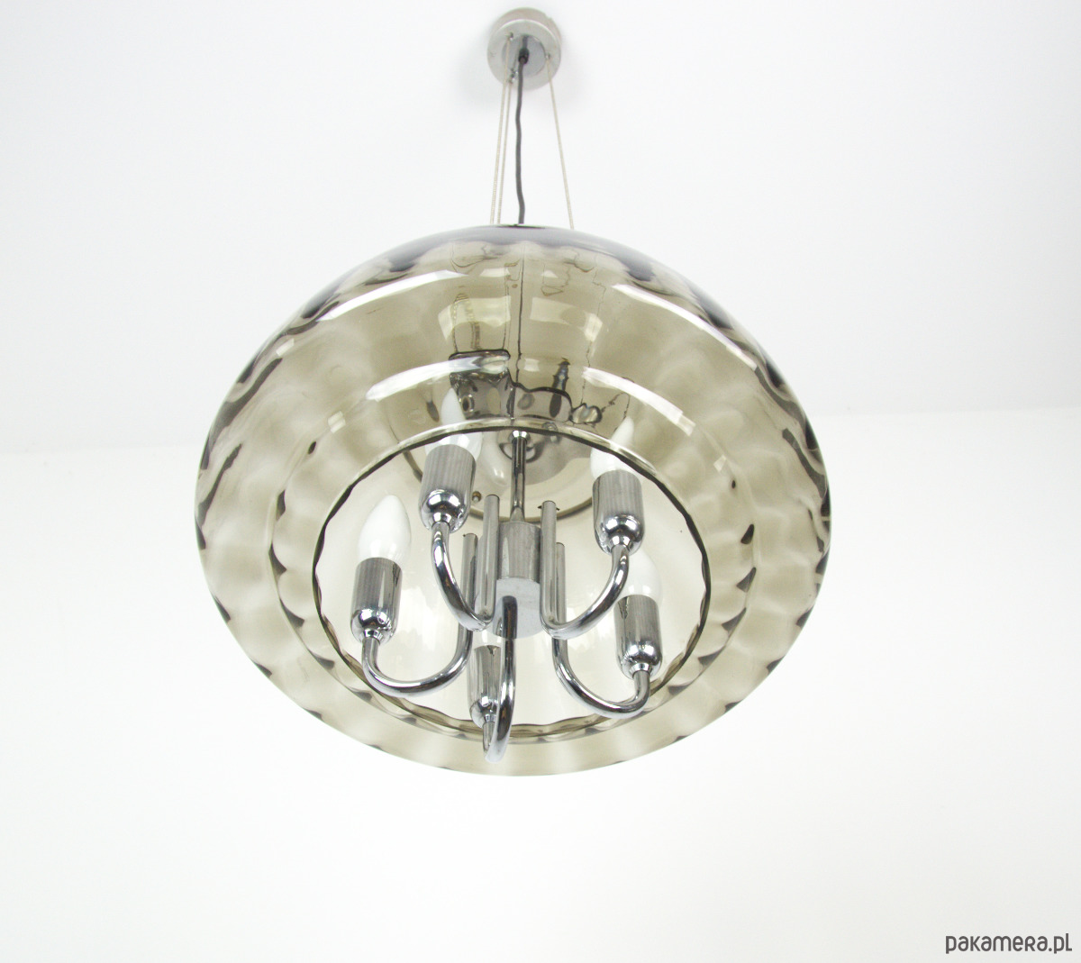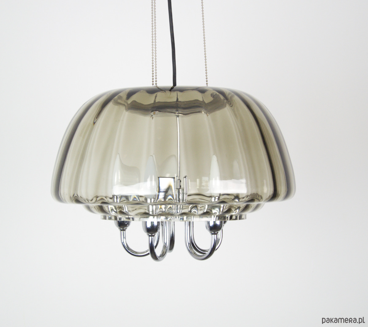 Duży żyrandol Limburg wykonany z dymionego szkła w latach 70. Dodatkwo klosz zabezpieczony przez trzy łańcuszki zamocowane do podsufitki. Pięć punktów świetlnych z oprawkami na żarówki E14. Stan lampy bardzo dobry, delikatnie odbarwiona podsufitka.