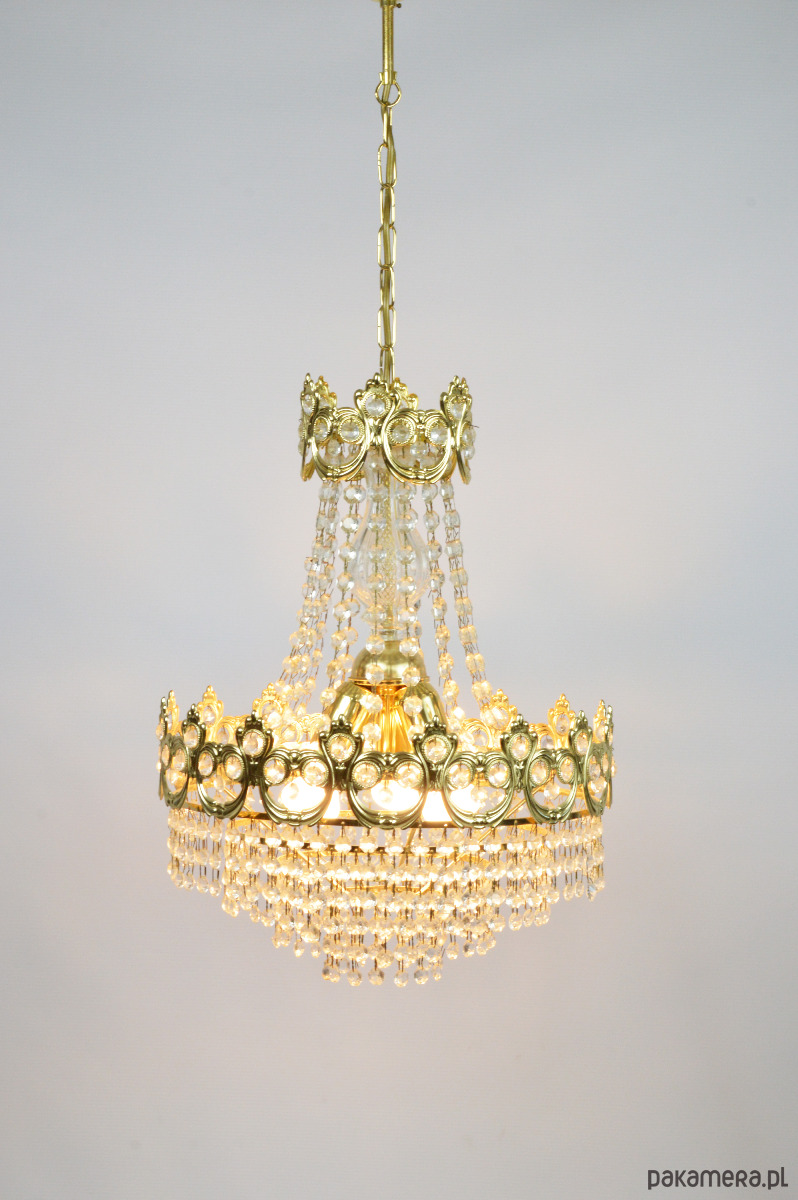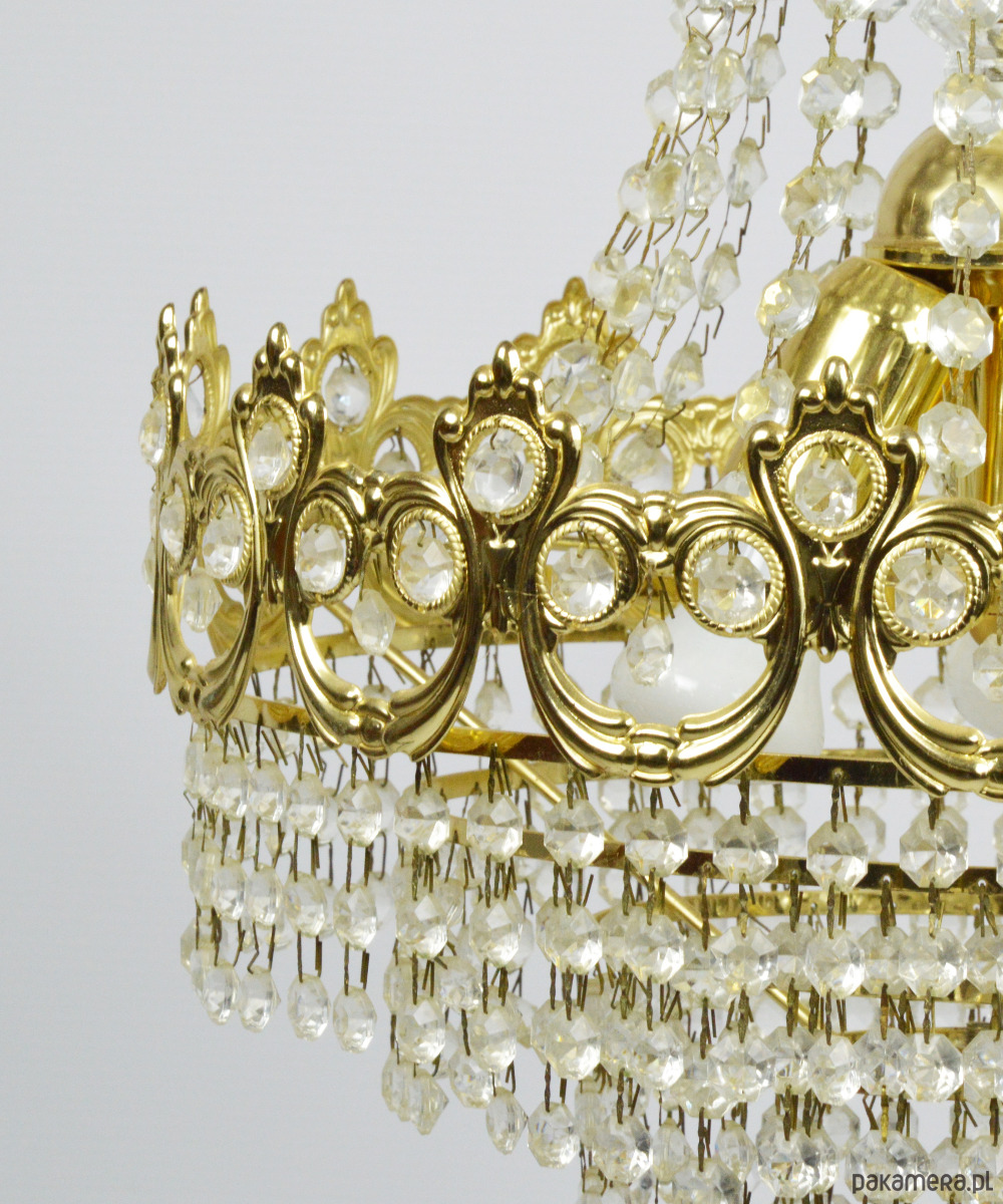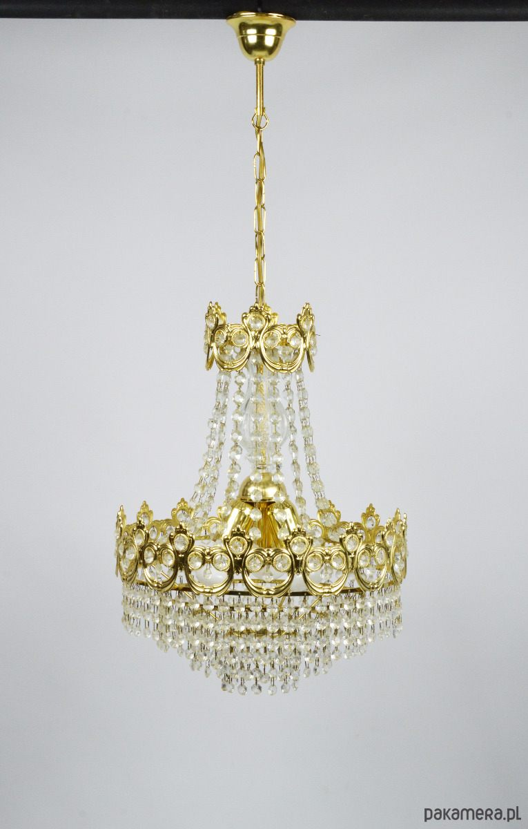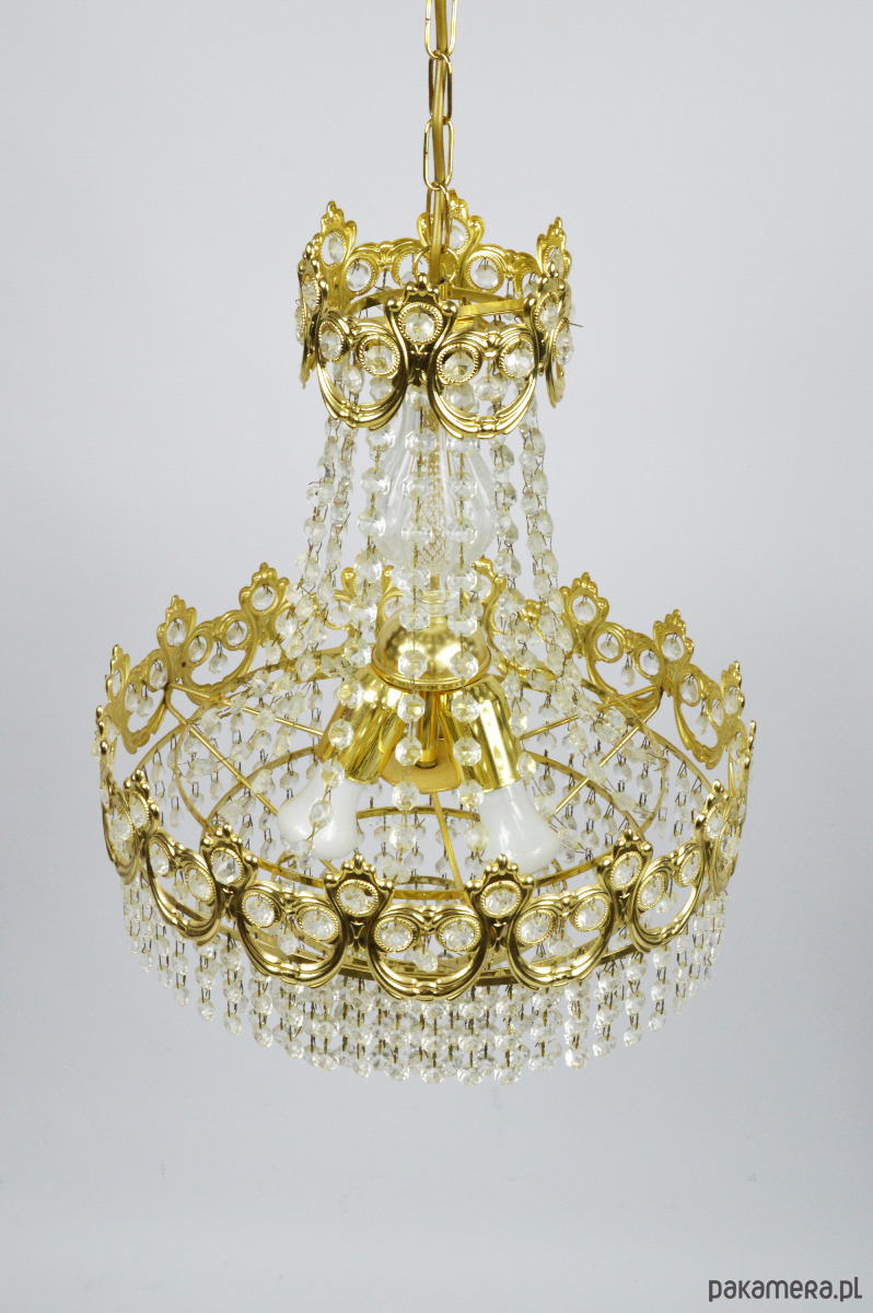 Złoty żyrandol wyprodukowany przez Massive w latach 70. Lampa jest kompletna i sprawna, wymaga 3 żarówek E27. Stan zachowania bardzo dobry.