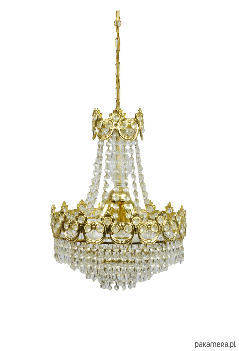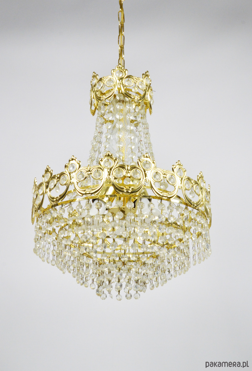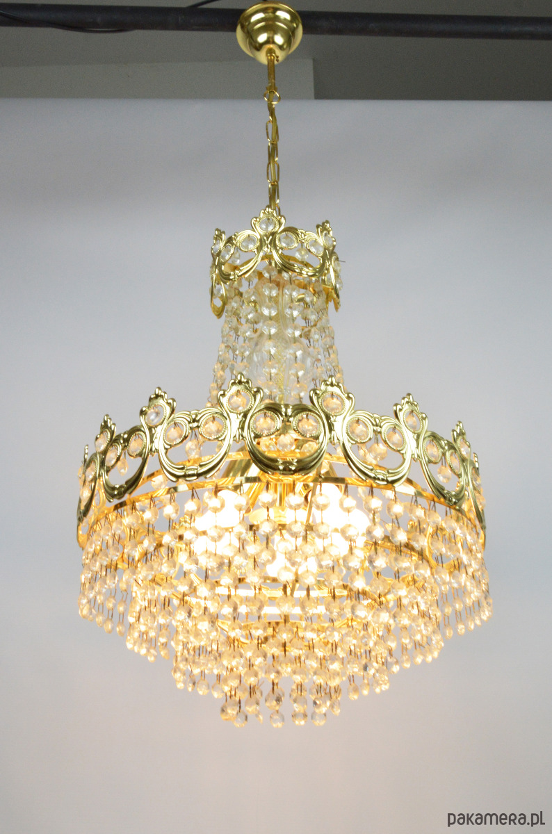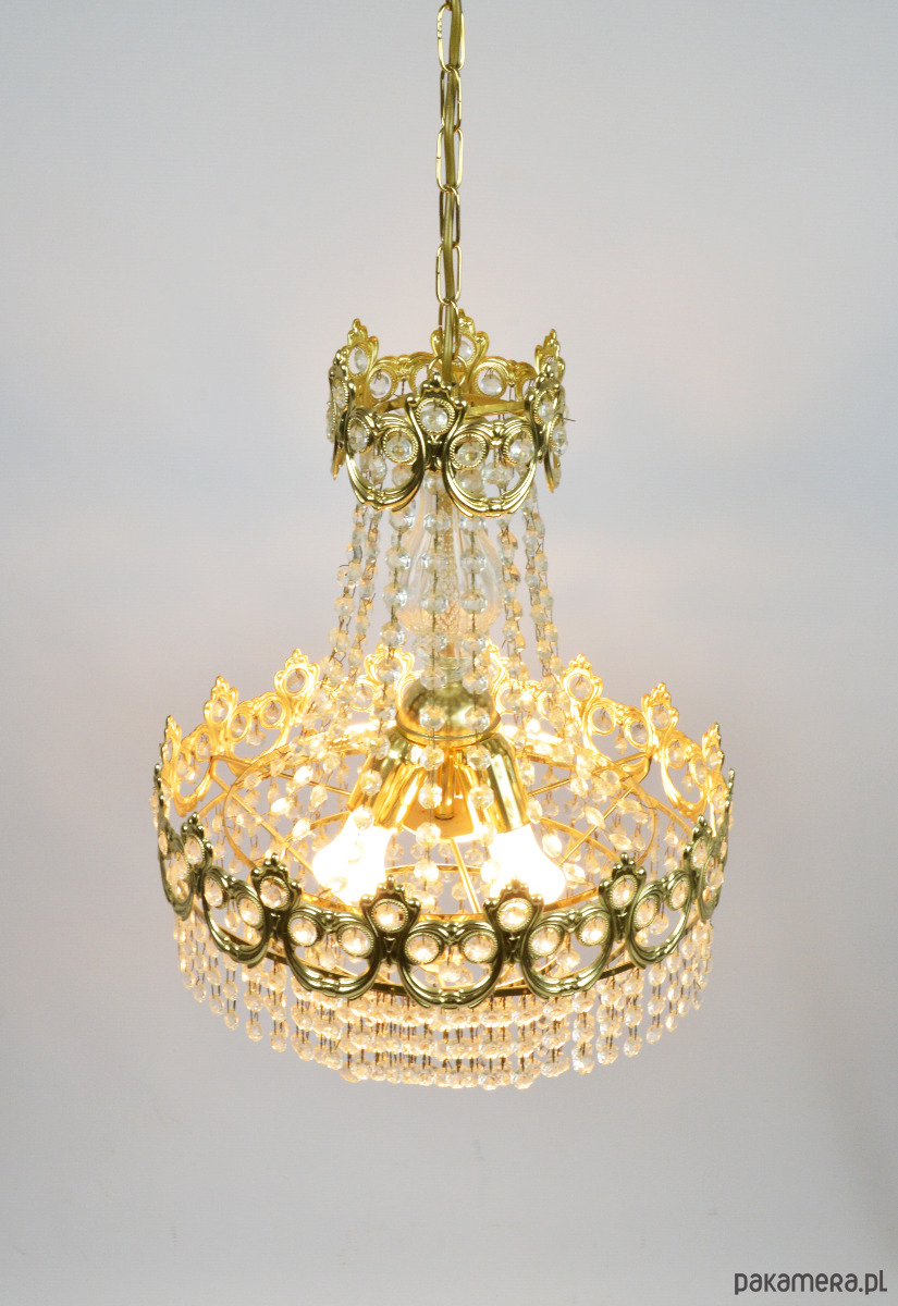 Złoty żyrandol wyprodukowany przez Massive w latach 70. Lampa jest kompletna i sprawna, wymaga 3 żarówek E27. Stan zachowania bardzo dobry.