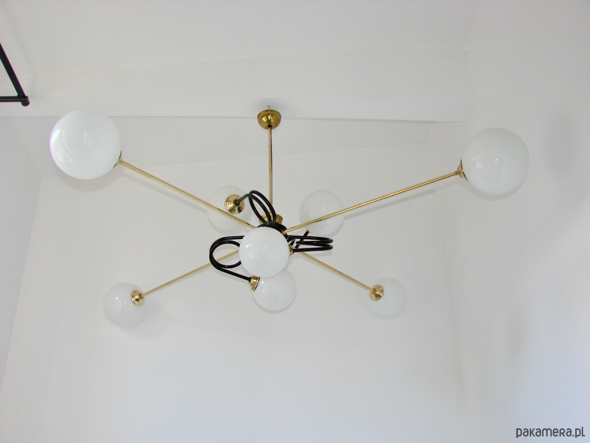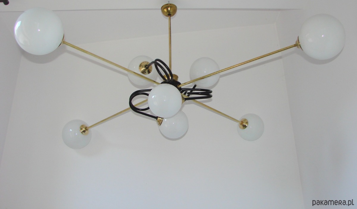 Żyrandol wymaga 8 żarówek E14, które zapewniają ciepłe, równomierne oświetlenie pomieszczenia. Idealny do salonu, jadalni, loftu lub przestrzeni inspirowanych designem połowy XX wieku.