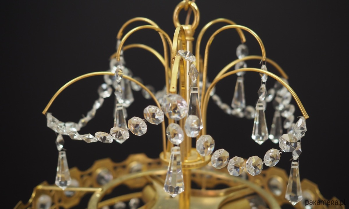 Stan: Żyrandol zachowany w oryginalnym stanie z widocznymi normalnymi śladami użytkowania (drobne zarysowania oraz obicia). Przewód oryginalny, żarówka E14. Na lampie nie ma oznaczeń maksymalnej mocy żarówki. Lampa nie posiada podsufitki. Wszystkie lampy są przez nas sprawdzone pod względem sprawności elektryki.