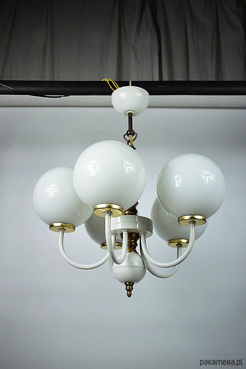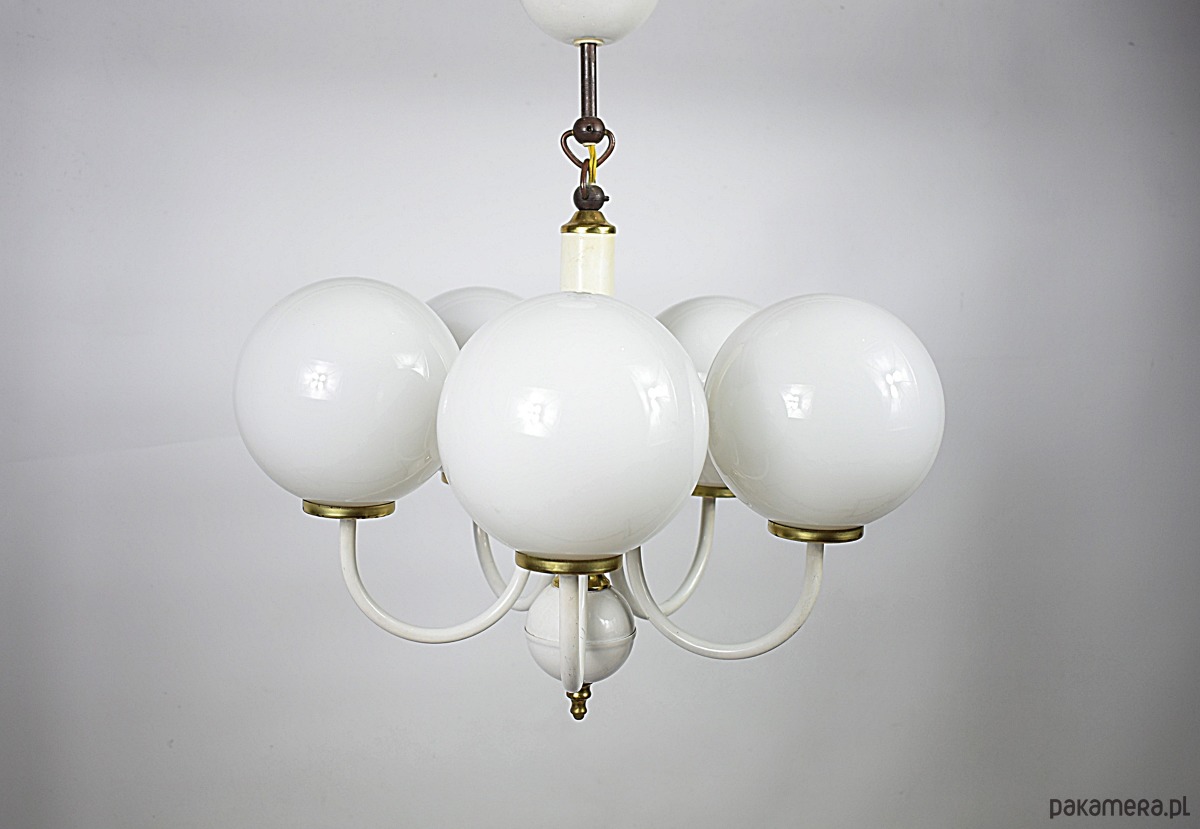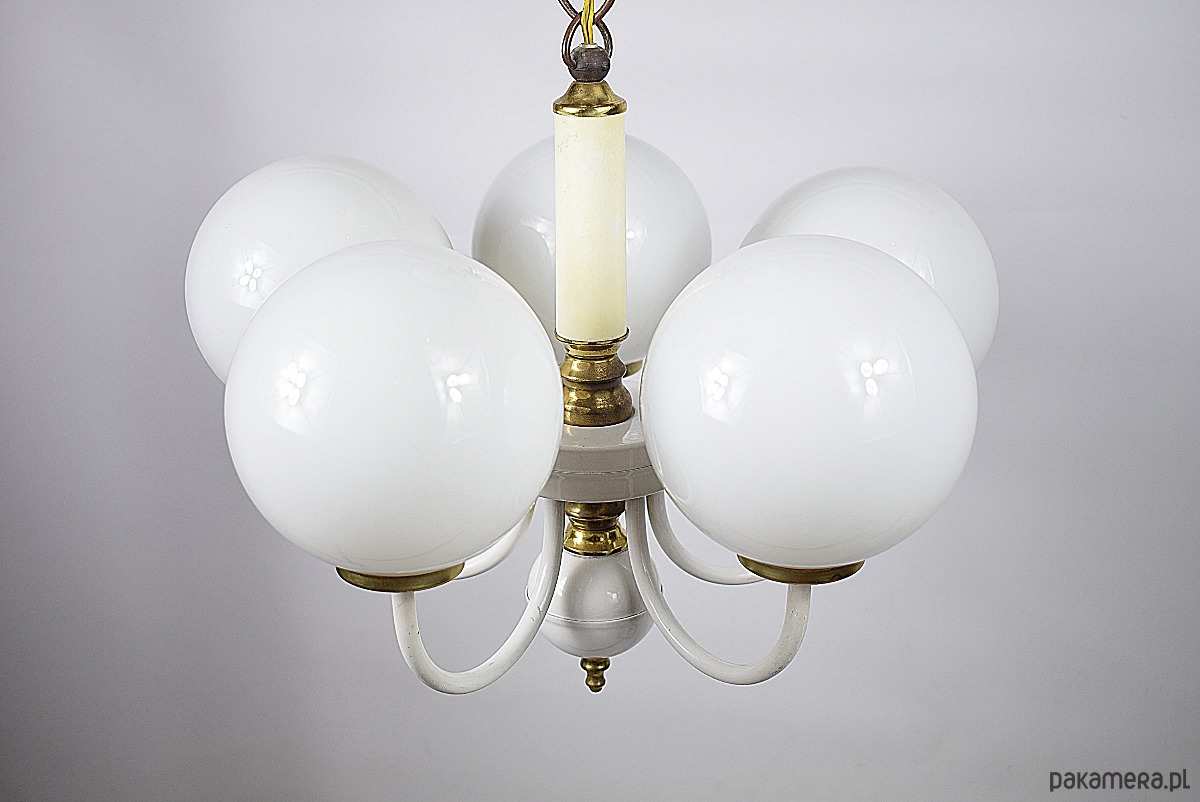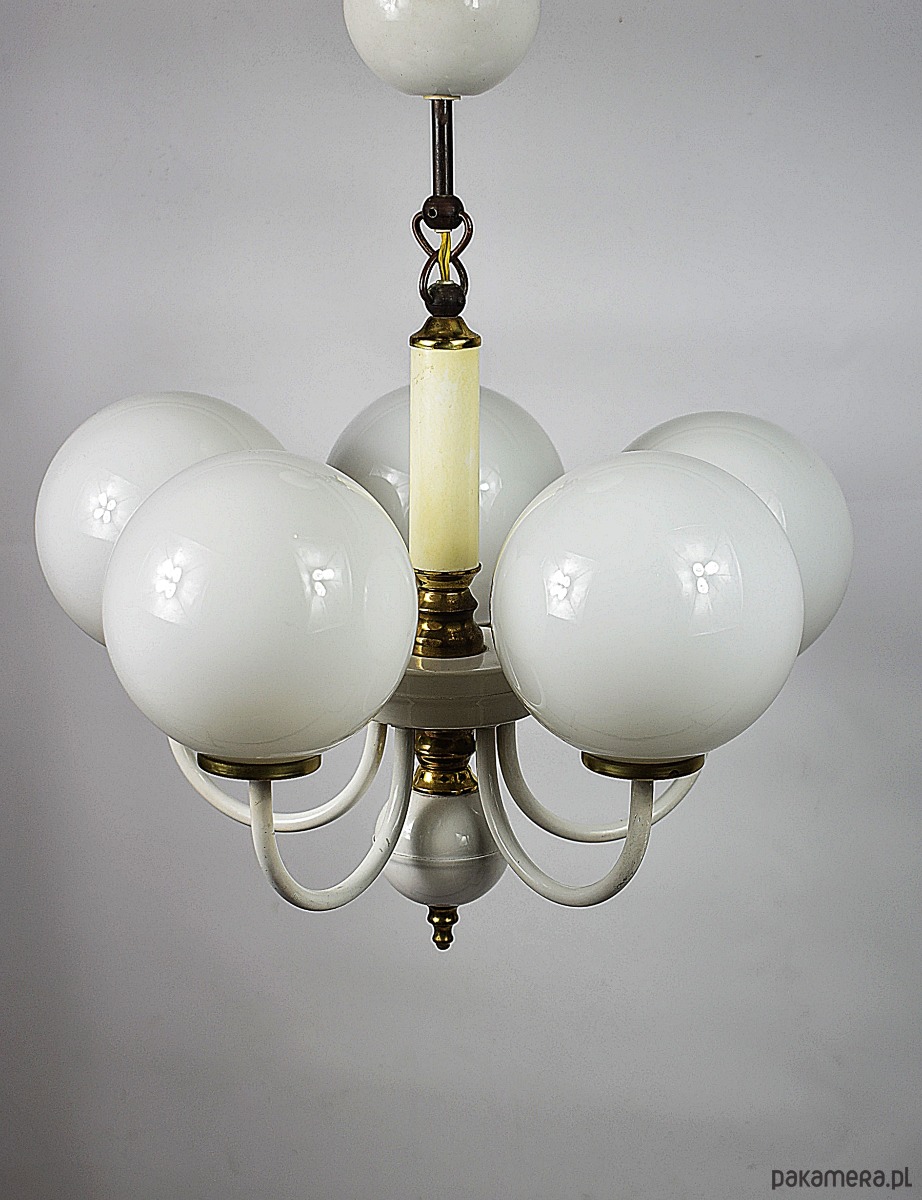 Żyrandol, Polska lat 70. Żyrandol z kloszami wykonanymi ze szkła opalizującego. Lampa w stanie dobrym, posiada typowe ślady użytkowania.