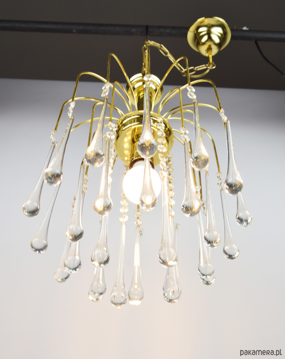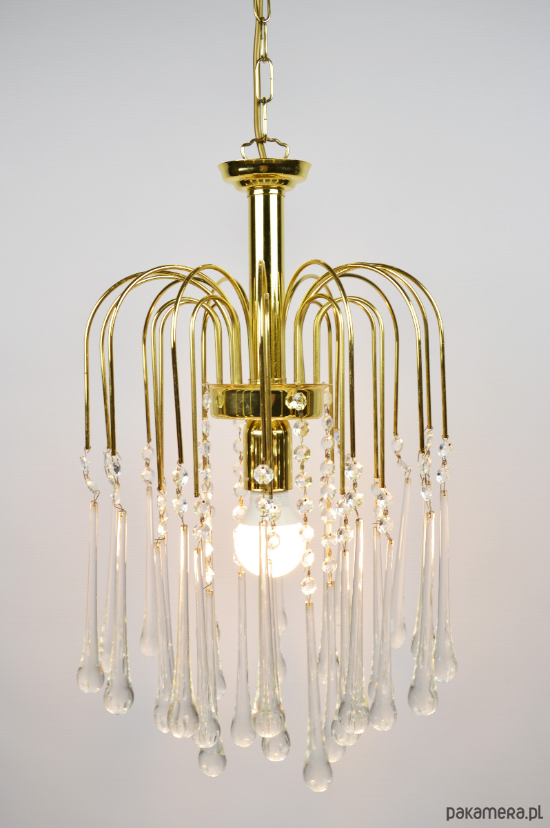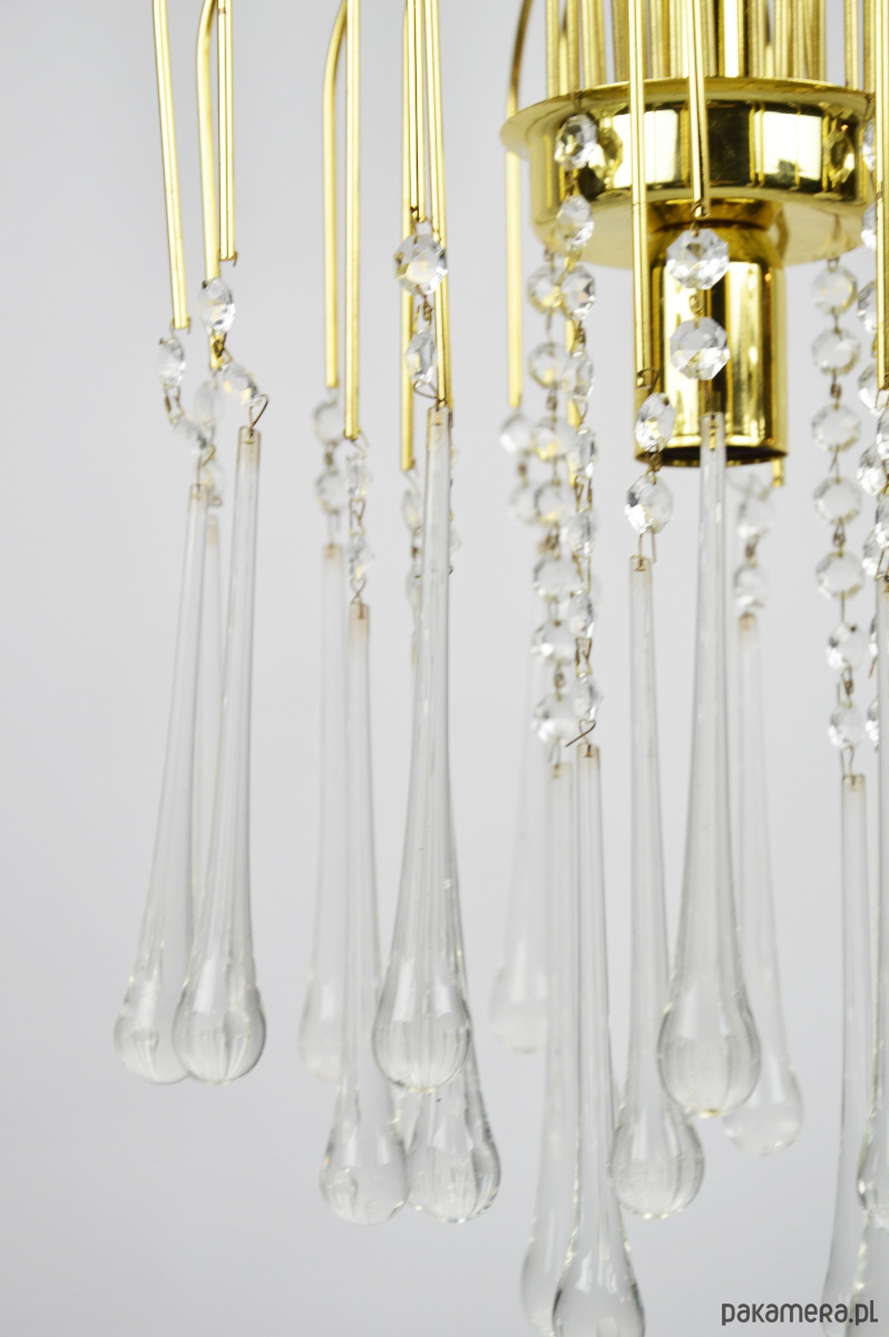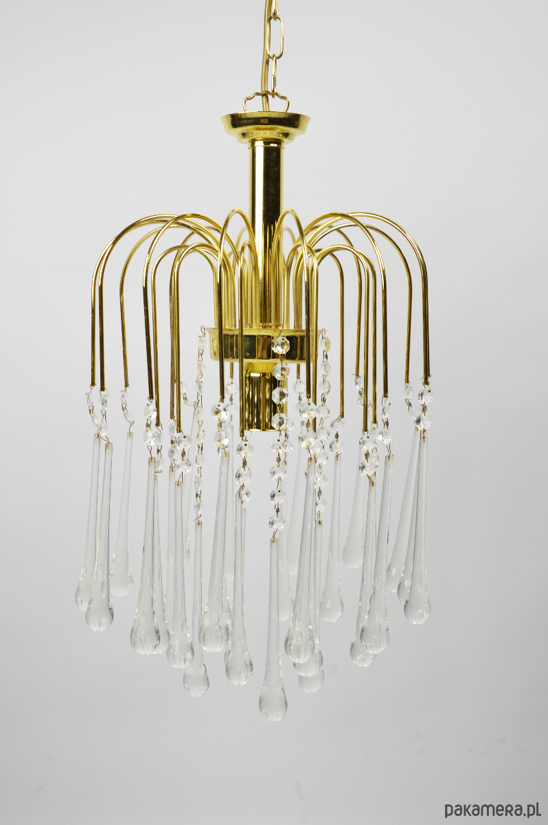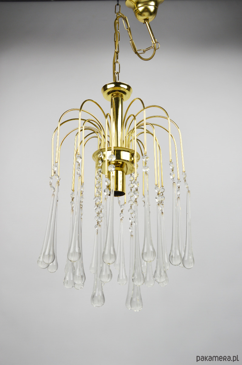 Lampa zaprojektowana przez Paolo Venini we Włoszech, lata 60. Żyrandol składa się z przeźroczystych, szklanych sopli, które zjawiskowo rozpraszają wpadające w nie światło. Stan zachowania bardzo dobry, widoczne utlenienia na złotych elementach. Żyrandol jest kompletny oraz sprawny technicznie.