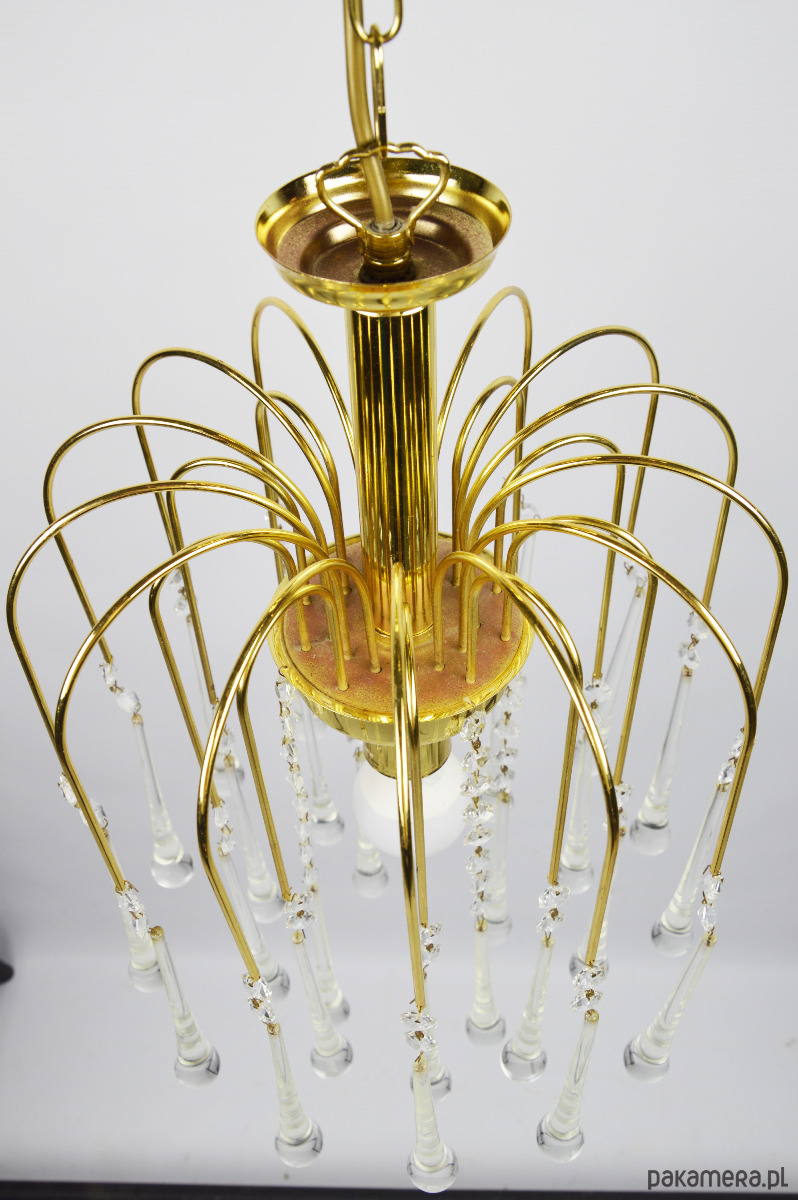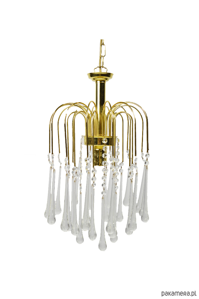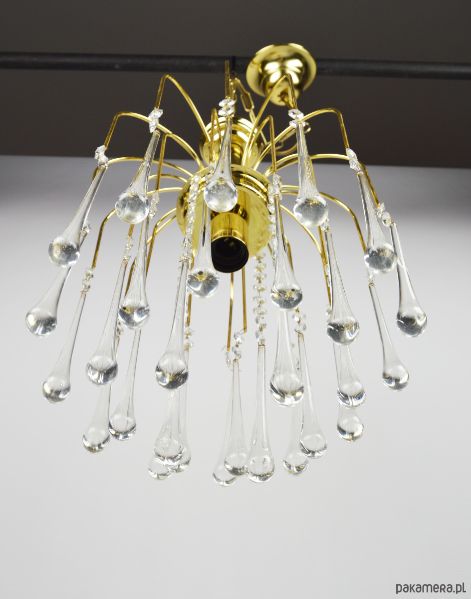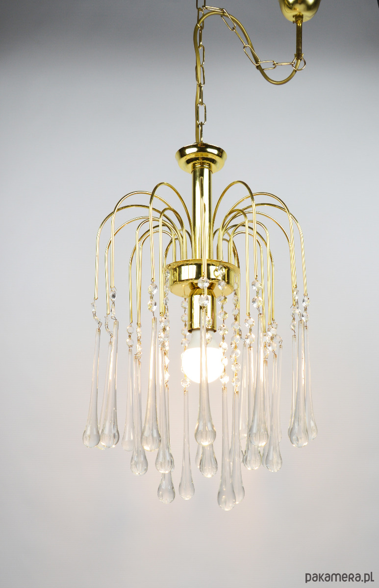 Lampa zaprojektowana przez Paolo Venini we Włoszech, lata 60. Żyrandol składa się z przeźroczystych, szklanych sopli, które zjawiskowo rozpraszają wpadające w nie światło. Stan zachowania bardzo dobry, widoczne utlenienia na złotych elementach. Żyrandol jest kompletny oraz sprawny technicznie.