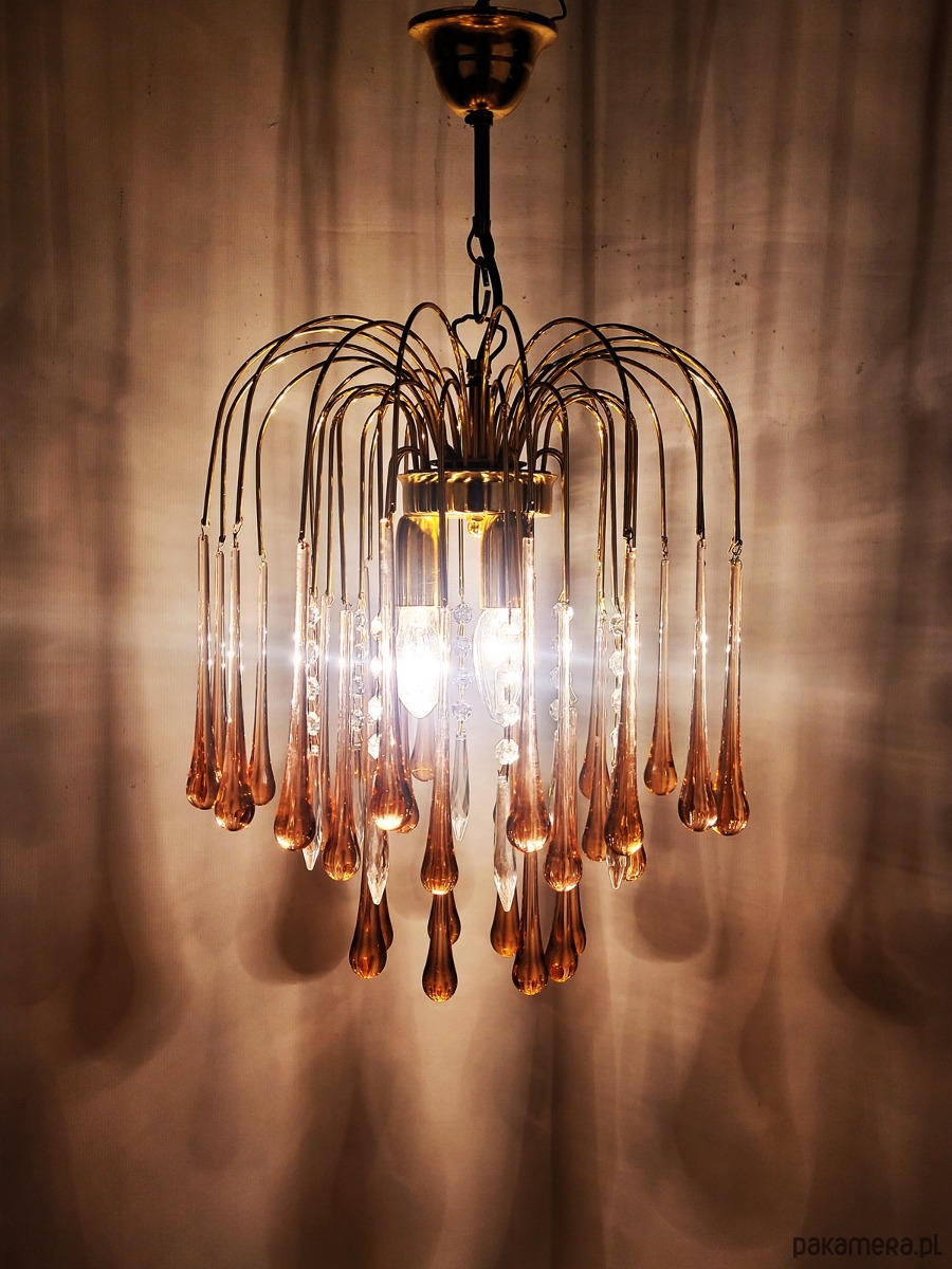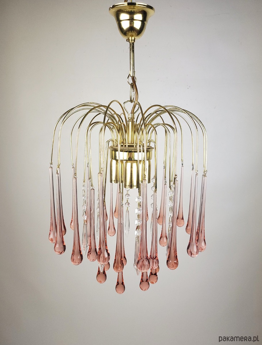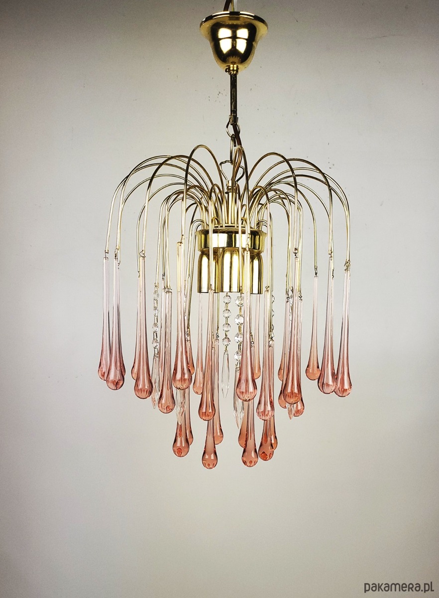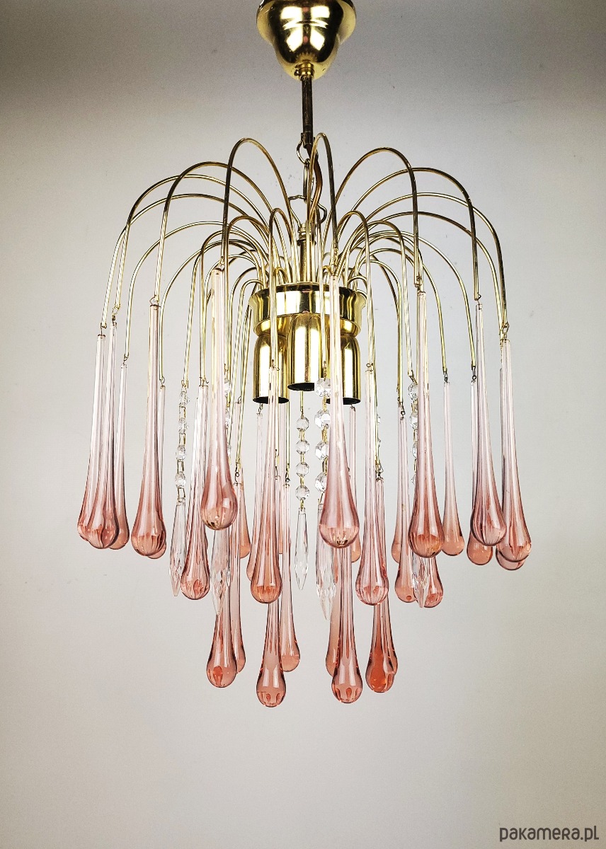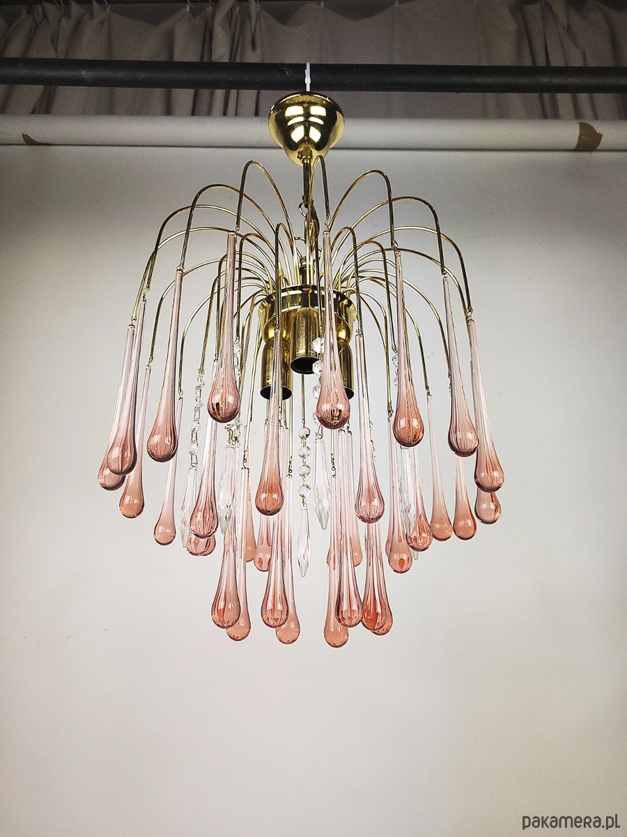 Żyrandol zaprojektowany przez Paolo Venini we Włoszech, lata 60. Żyrandol składa się z przeźroczystych i rozalinowych sopli Murano oraz mniejszych przeźroczystych szkiełek. Wymaga trzech żarówek E14. Lampa jest kompletna i całkowicie sprawna. Posiada tlenienia materiału widoczne na zdjęciach.