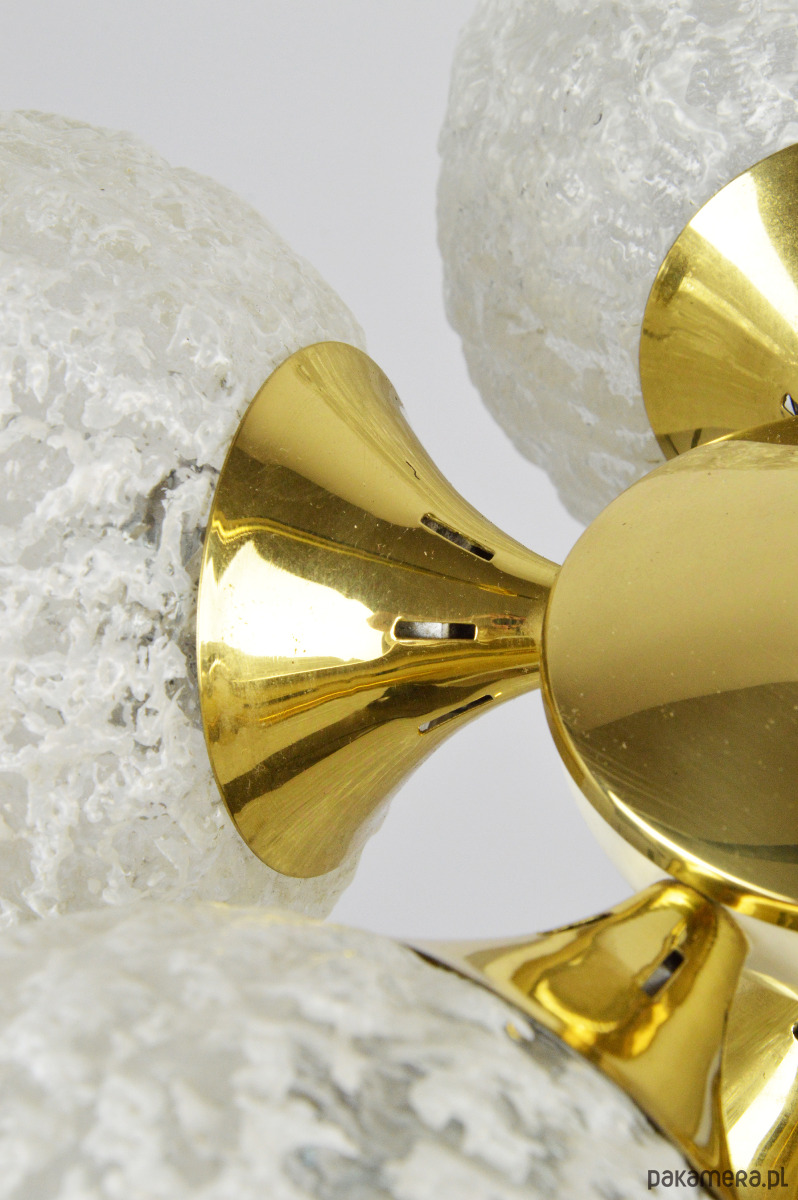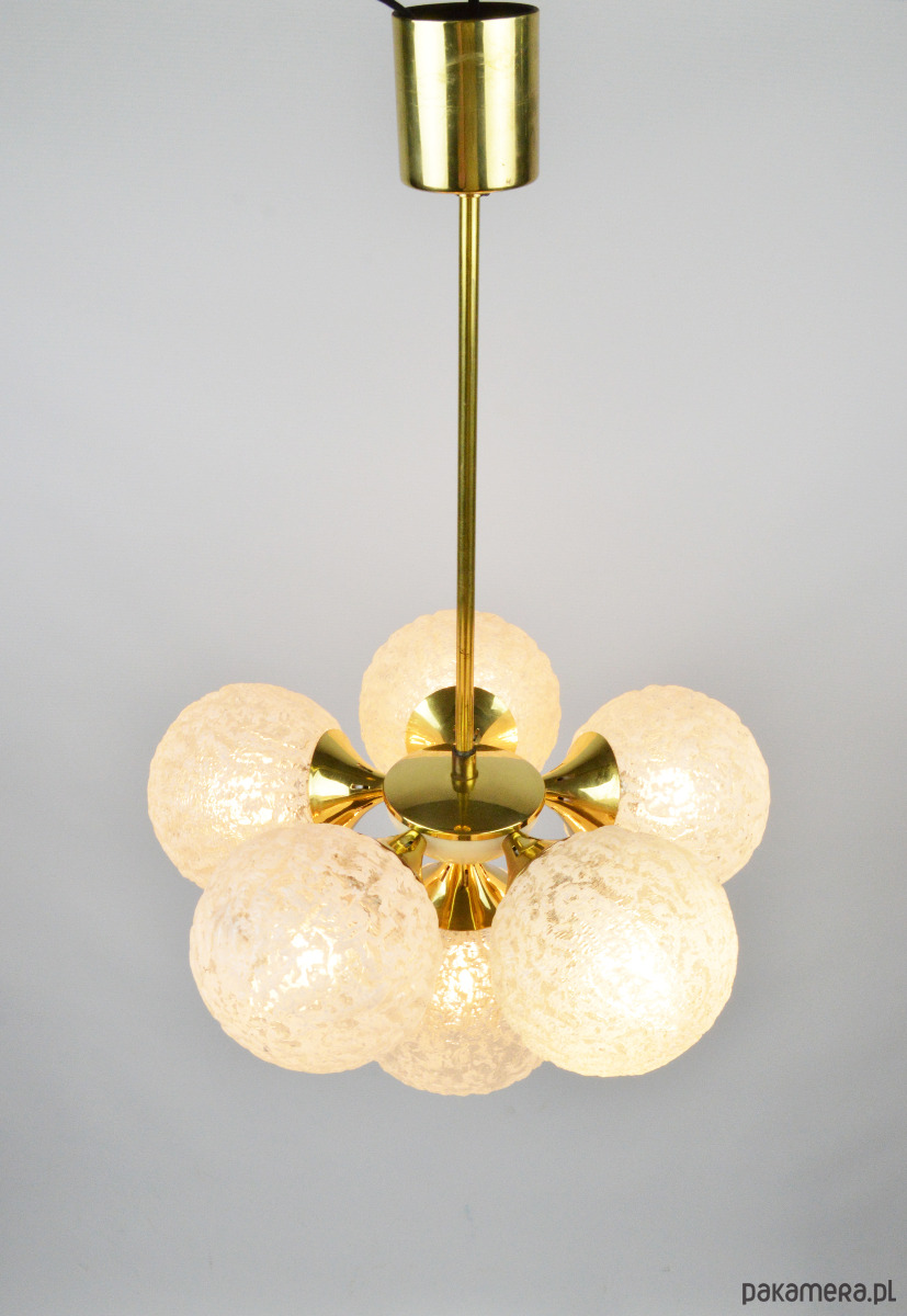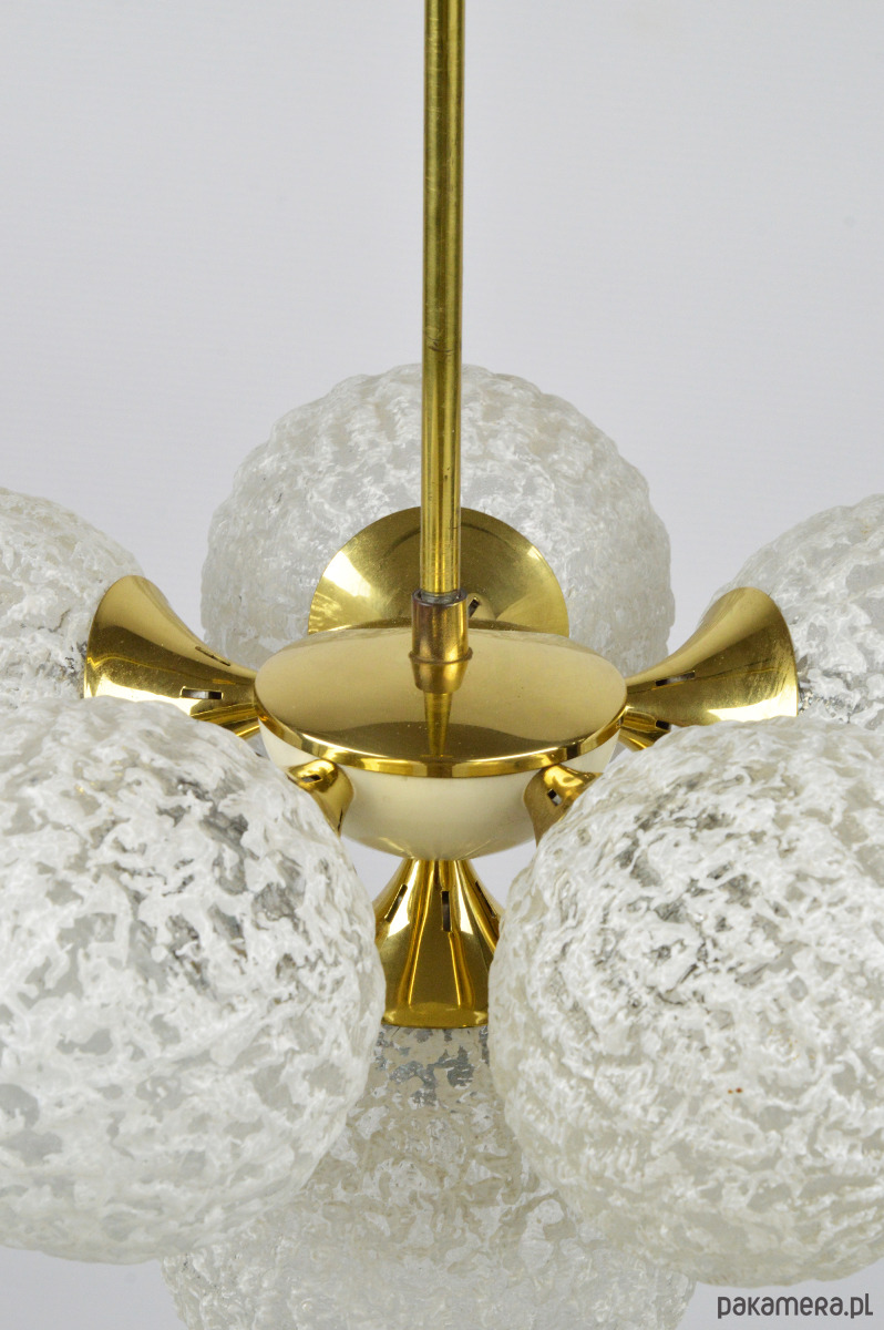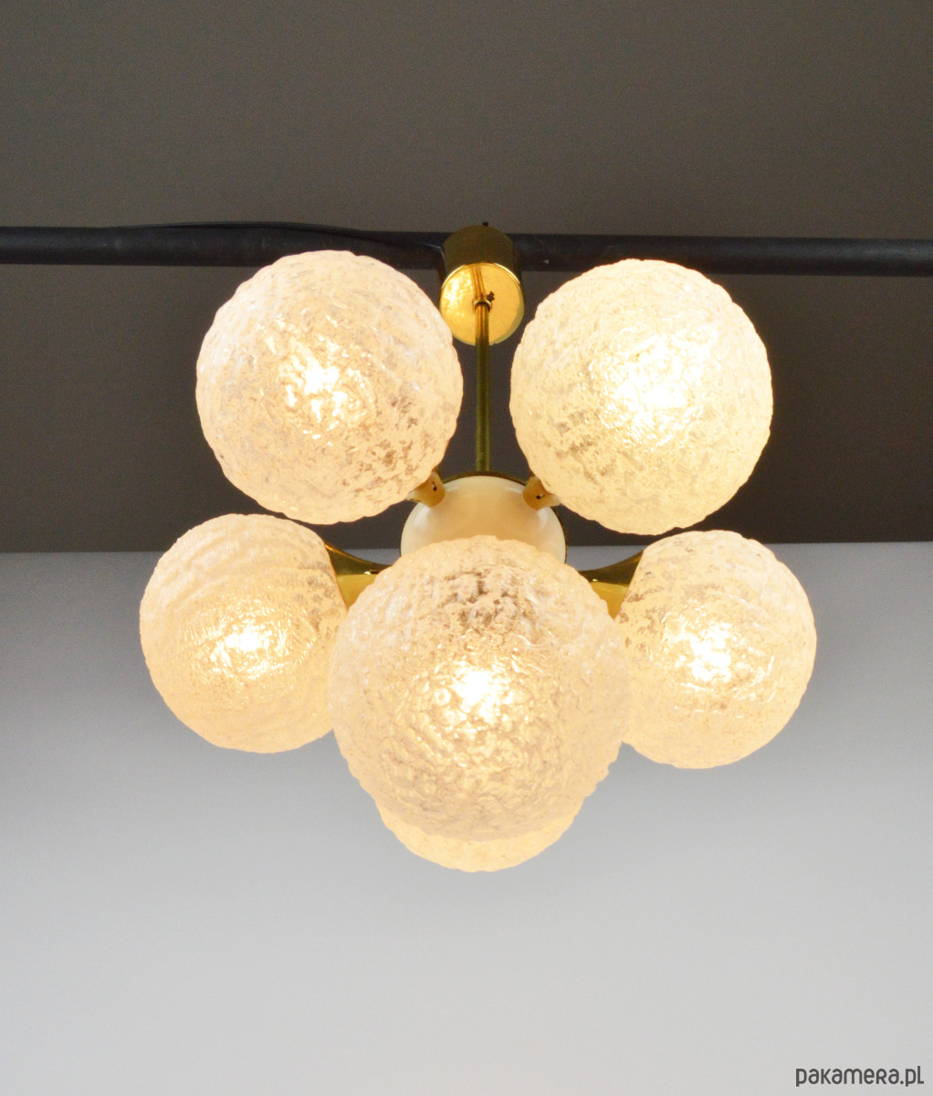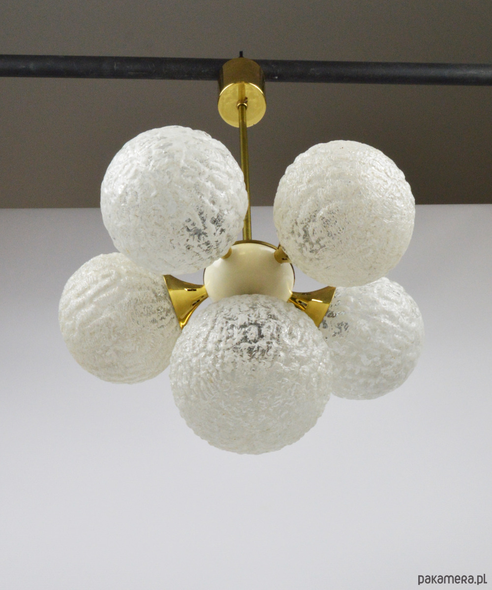 Żyrandol w typie Sputnika z lat 70. Lampa posiada sześć kloszy wykonanych z białego, mrożonego szkła. Stan zachowania bardzo dobry, widoczne niewielkie rysy i utlenienia na złotych elementach (zdjęcia).