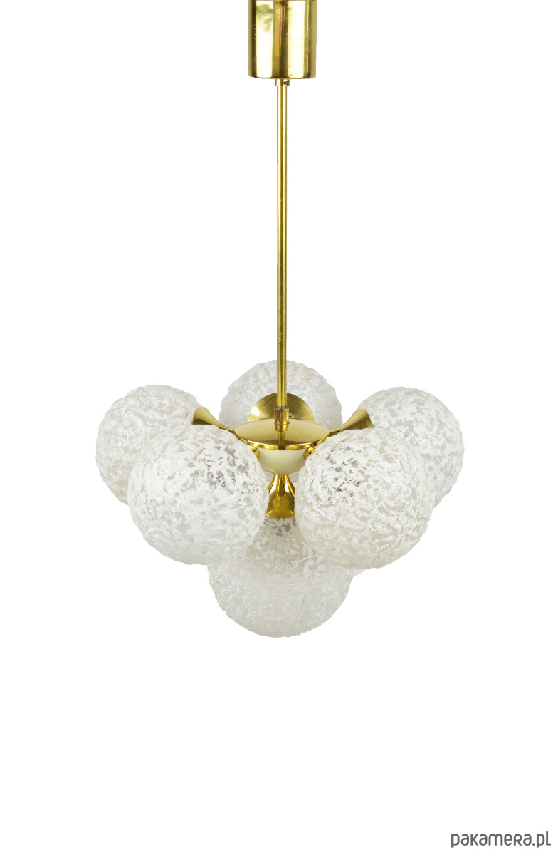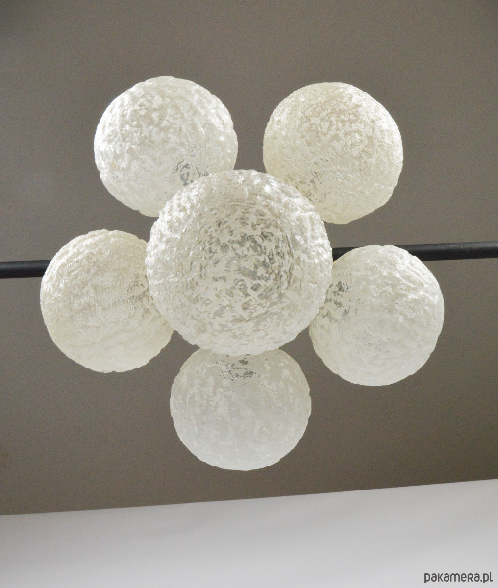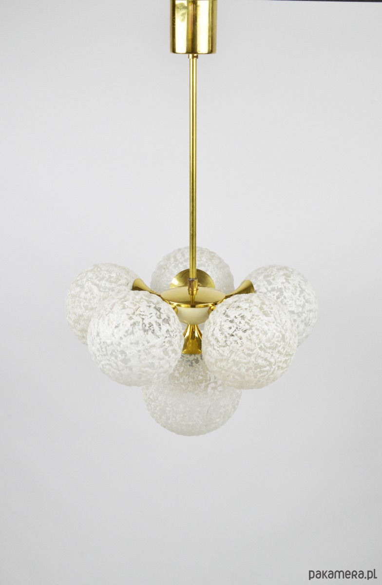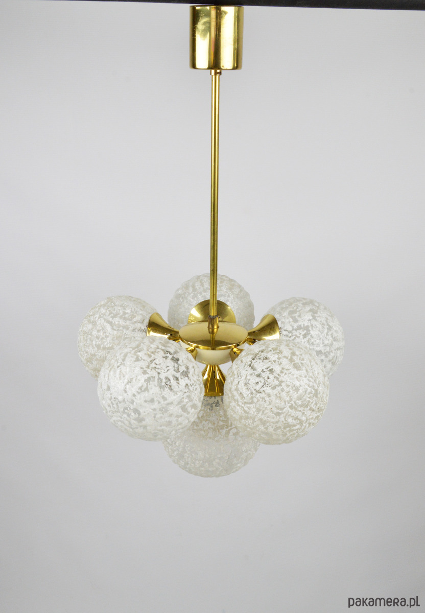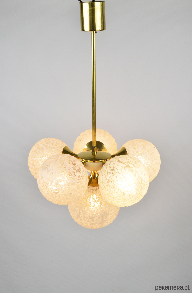 Żyrandol w typie Sputnika z lat 70. Lampa posiada sześć kloszy wykonanych z białego, mrożonego szkła. Stan zachowania bardzo dobry, widoczne niewielkie rysy i utlenienia na złotych elementach (zdjęcia).