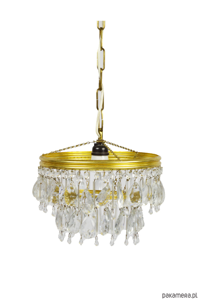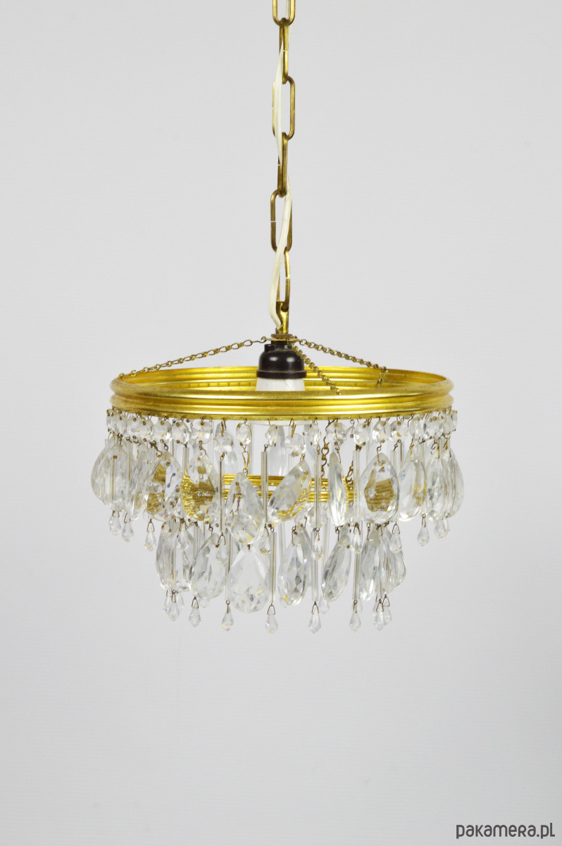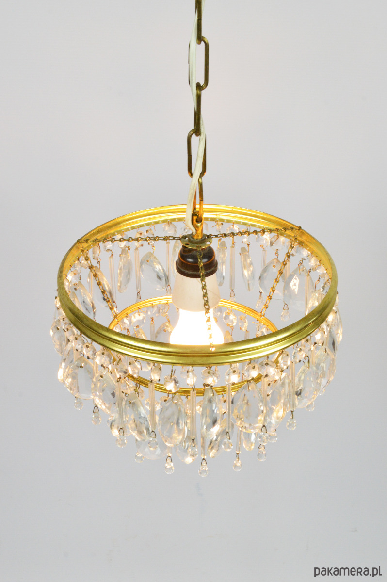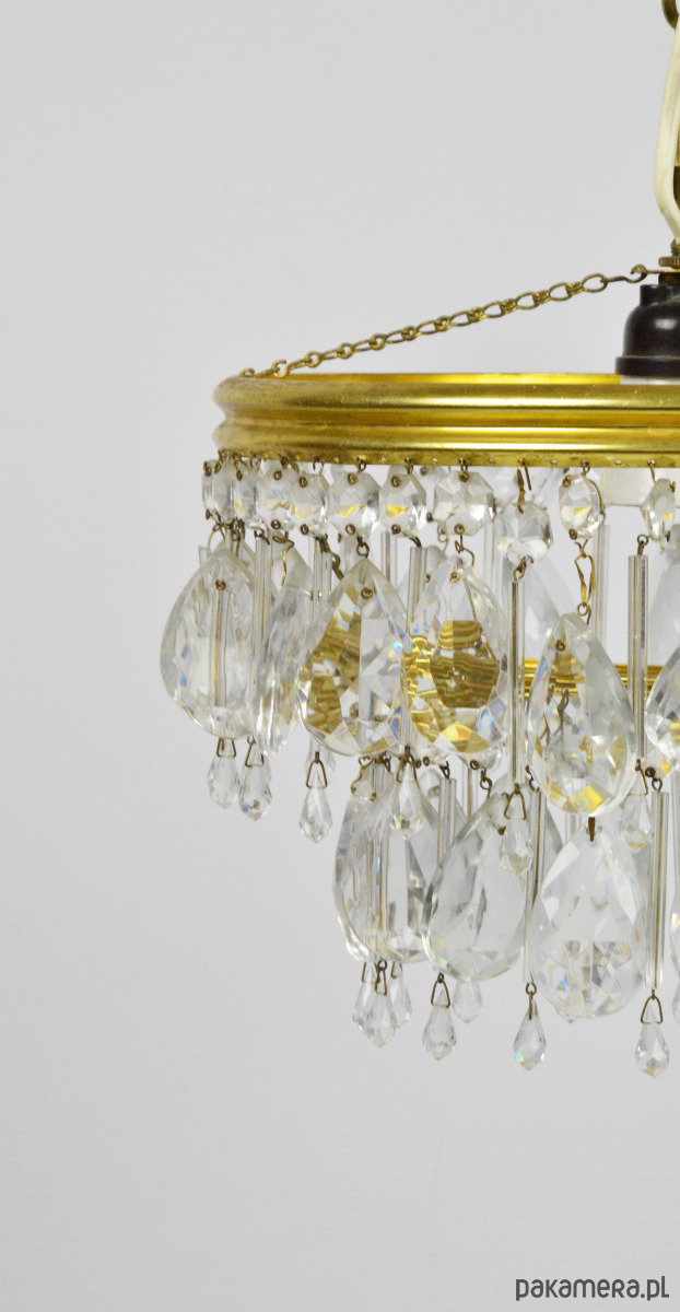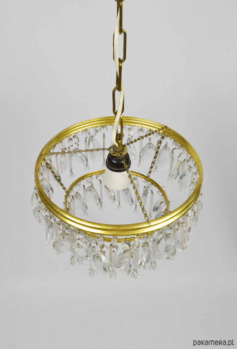 Żyrandol z wiszącymi szklanymi kryształkami z lat 70. Na dwóch złotych obręczach naprzemiennie zawieszone są szklane wisiorki w kształcie łezki i podłużne. Lampa jest kompletna i sprawna. Stan zachowania bardzo dobry, widoczne spękania ceramicznej oprawki.