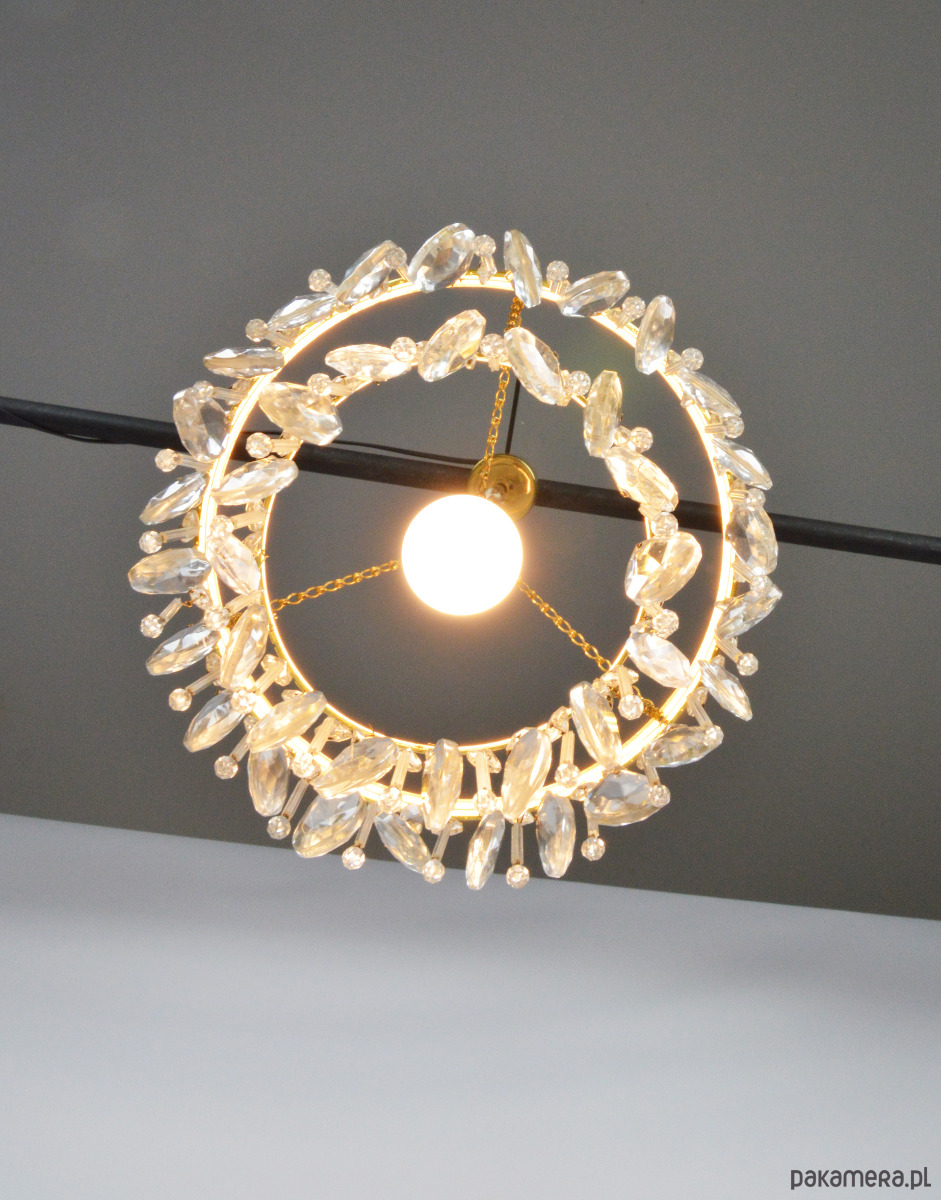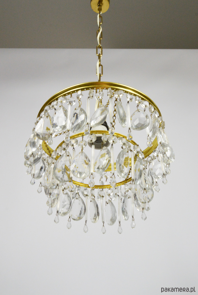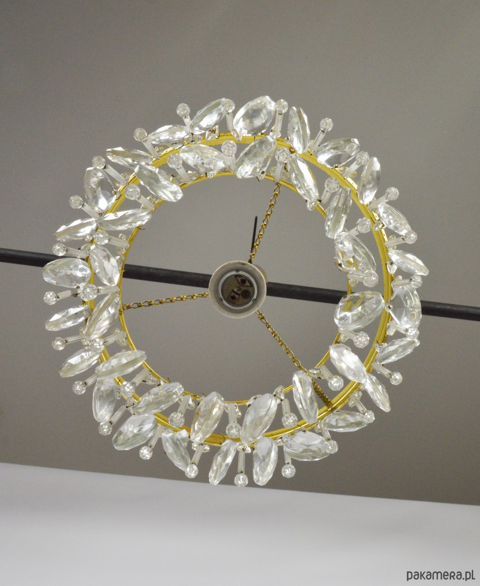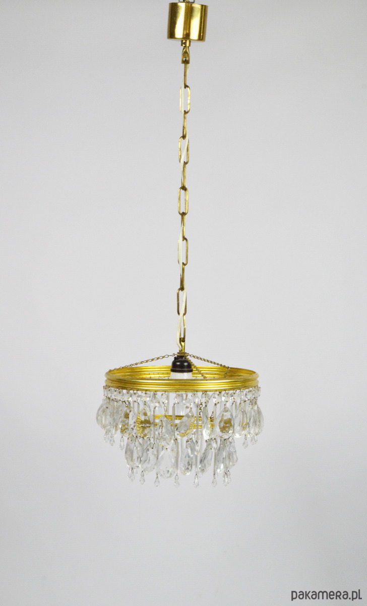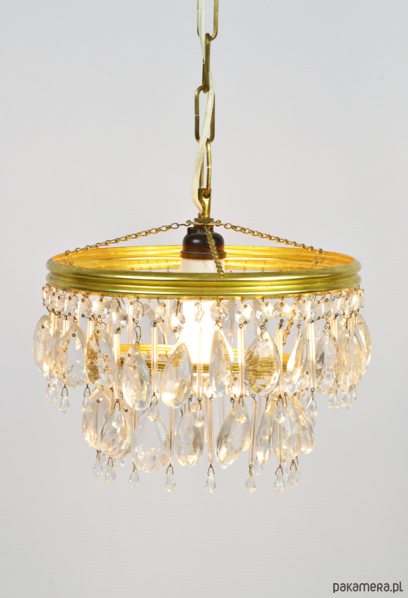 Żyrandol z wiszącymi szklanymi kryształkami z lat 70. Na dwóch złotych obręczach naprzemiennie zawieszone są szklane wisiorki w kształcie łezki i podłużne. Lampa jest kompletna i sprawna. Stan zachowania bardzo dobry, widoczne spękania ceramicznej oprawki.