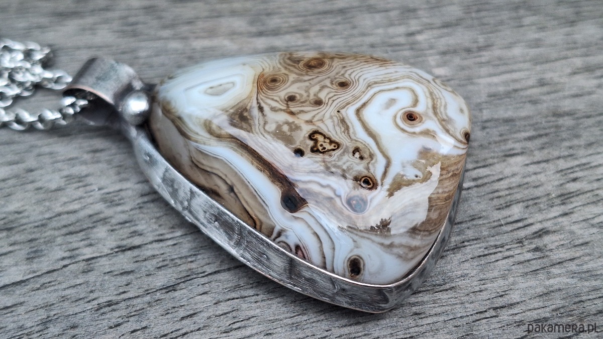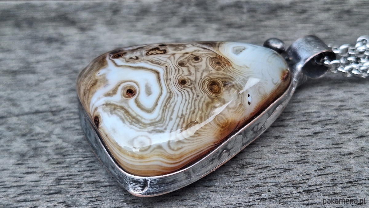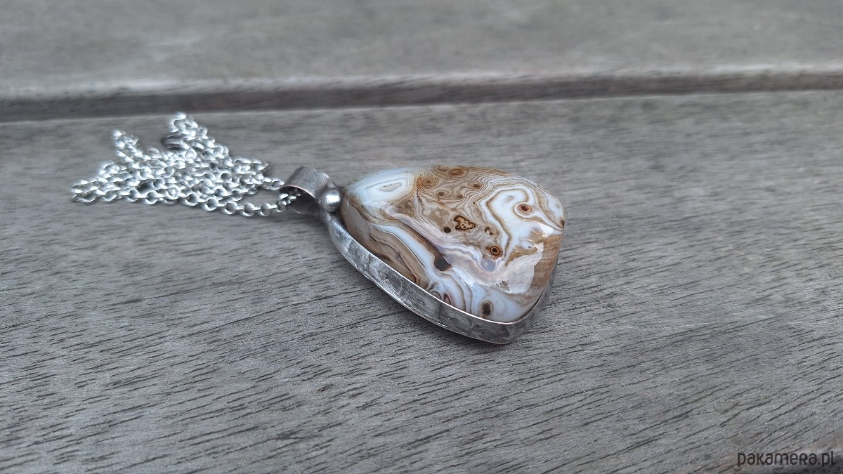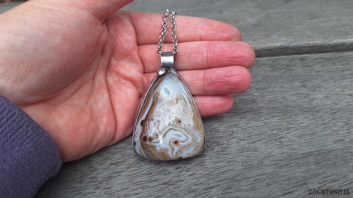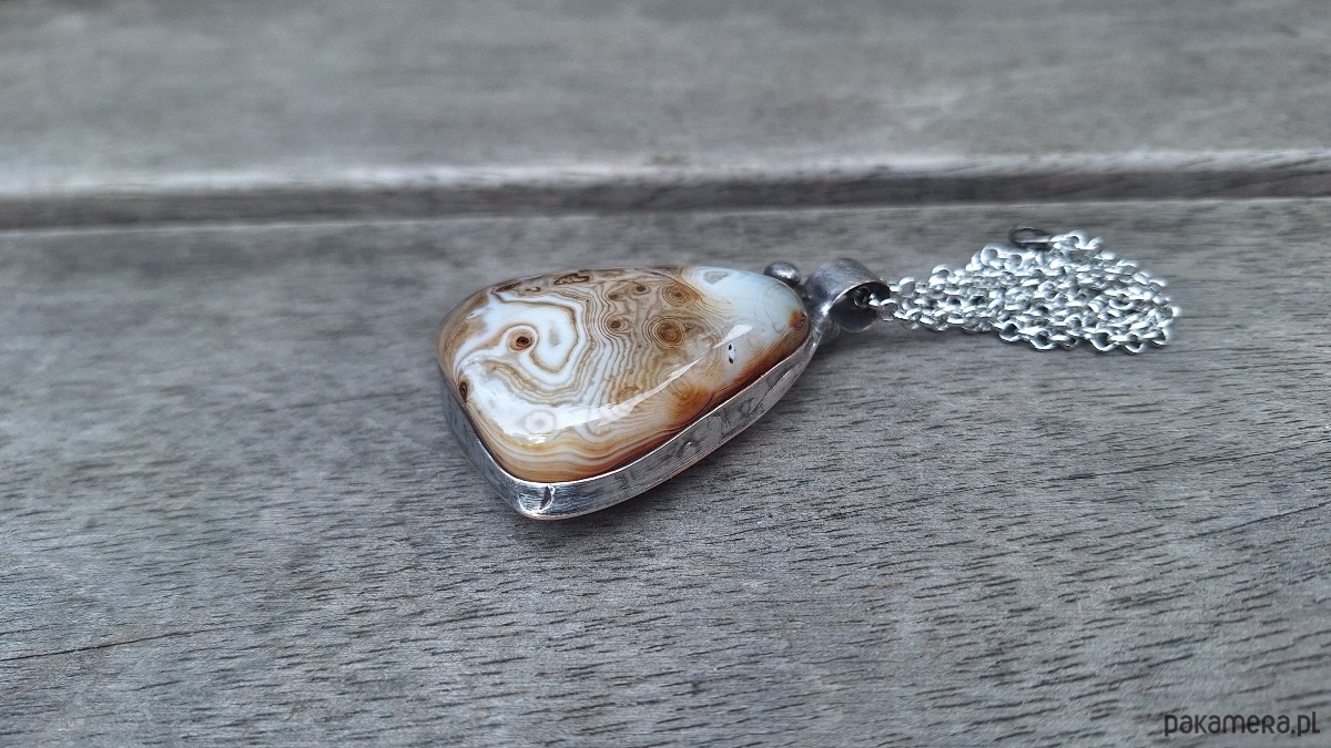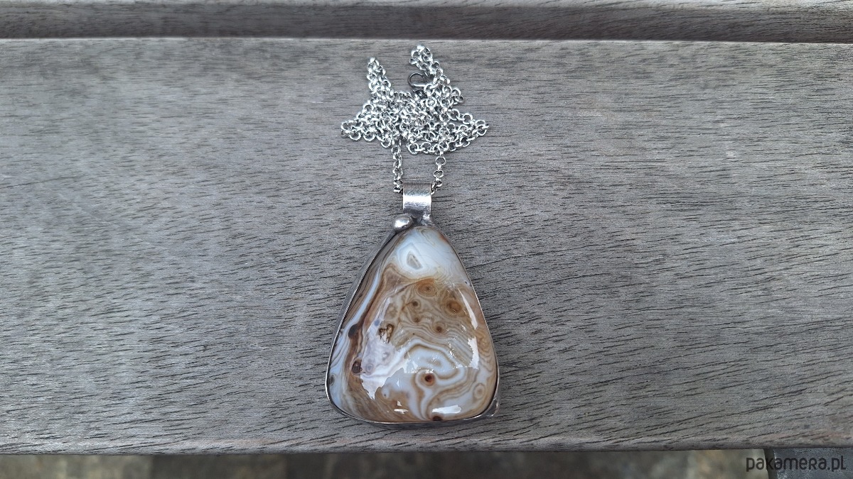 Wisiorek wykonany z miedzi, cyny i agatu. Wymiary ok. 5 na 4 cm. Zawieszony na łańcuszku o długości ok. 50 cm.