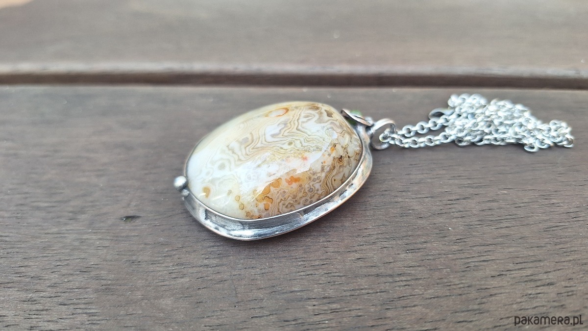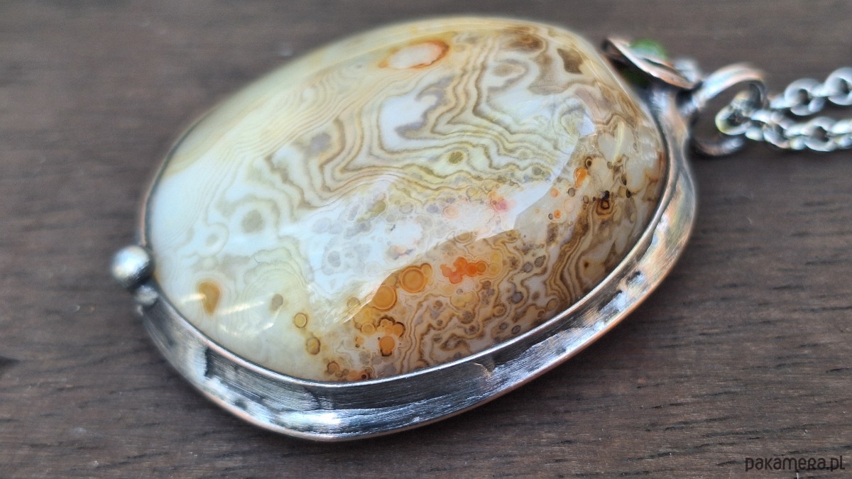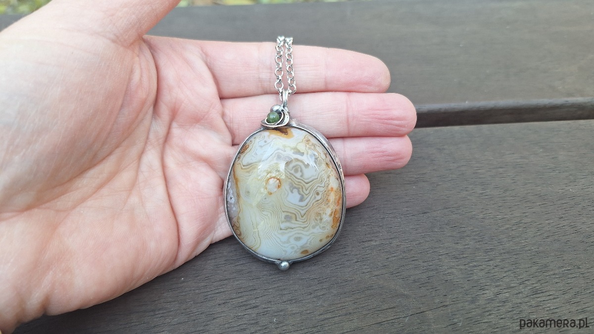 Wisiorek wykonany z miedzi, cyny, turmalinu i agatu. Wymiary ok. 5 na 4 cm. Zawieszony na łańcuszku o długości ok. 50 cm.