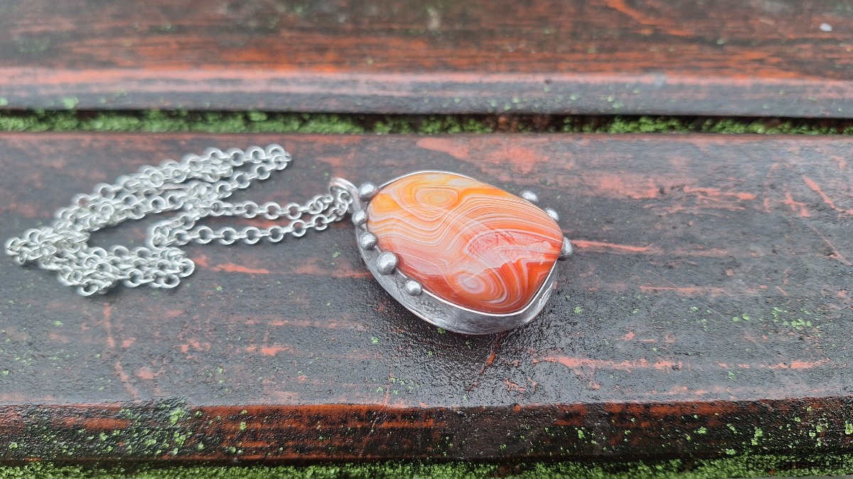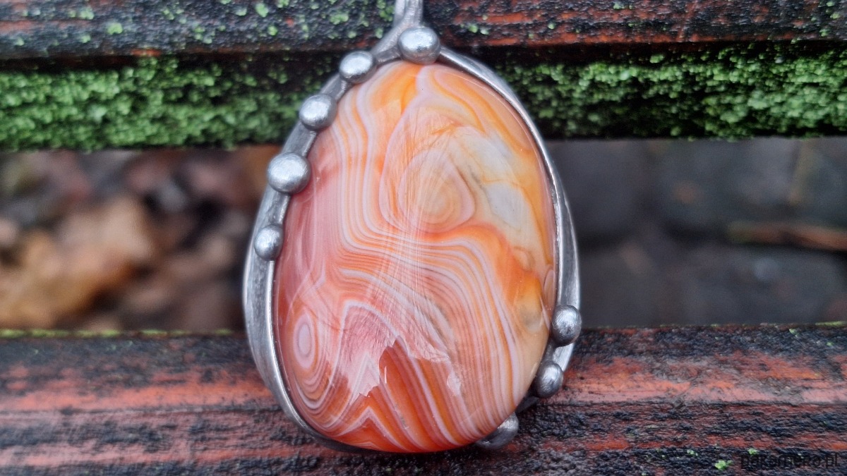Wisiorek wykonany z miedzi, cyny i agatu. Wymiary ok. 4 na 3 cm. Zawieszony na łańcuszku o długości ok. 50 cm.