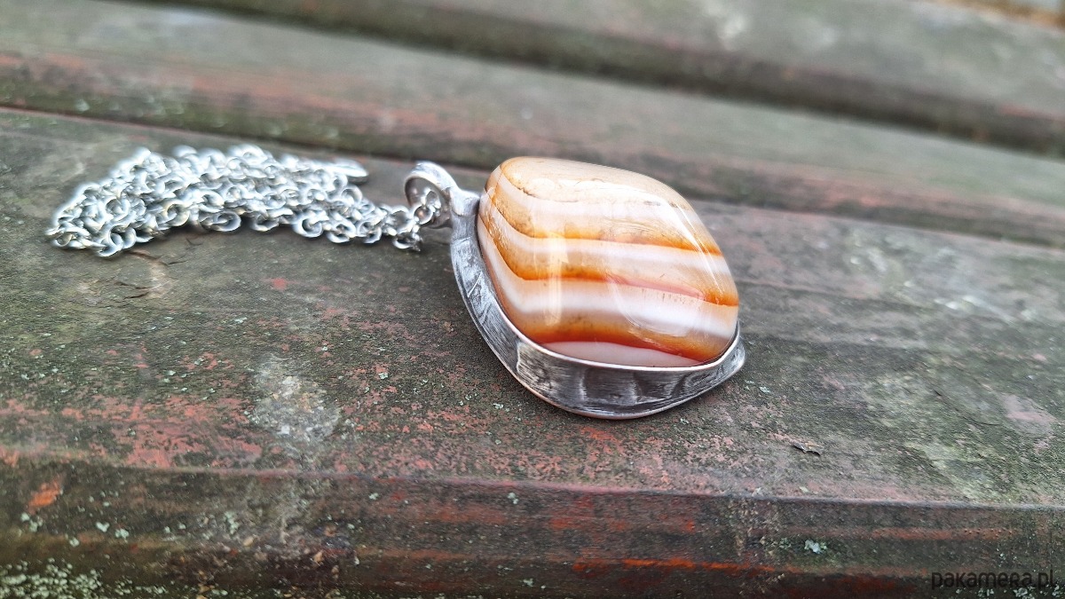 Wisiorek wykonany z miedzi, cyny i agatu. Wymiary ok. 4.5 na 3 cm. Zawieszony na łańcuszku o długości ok. 50 cm.
