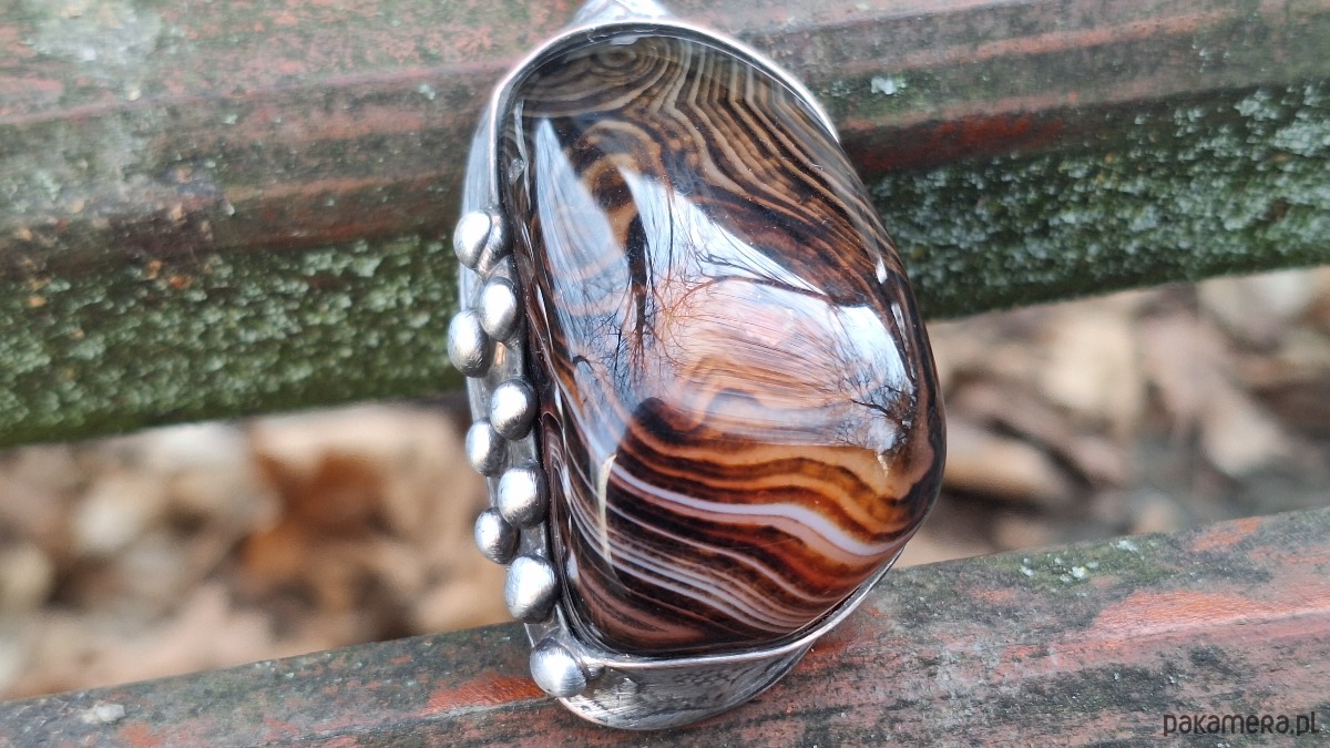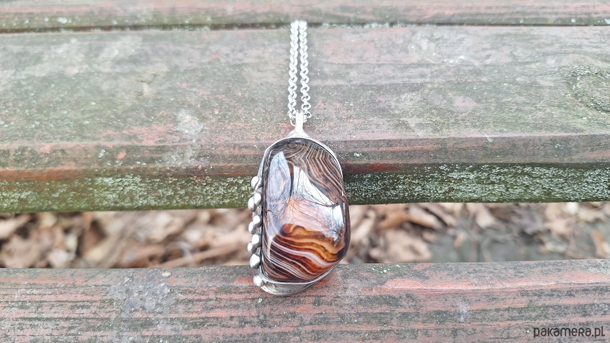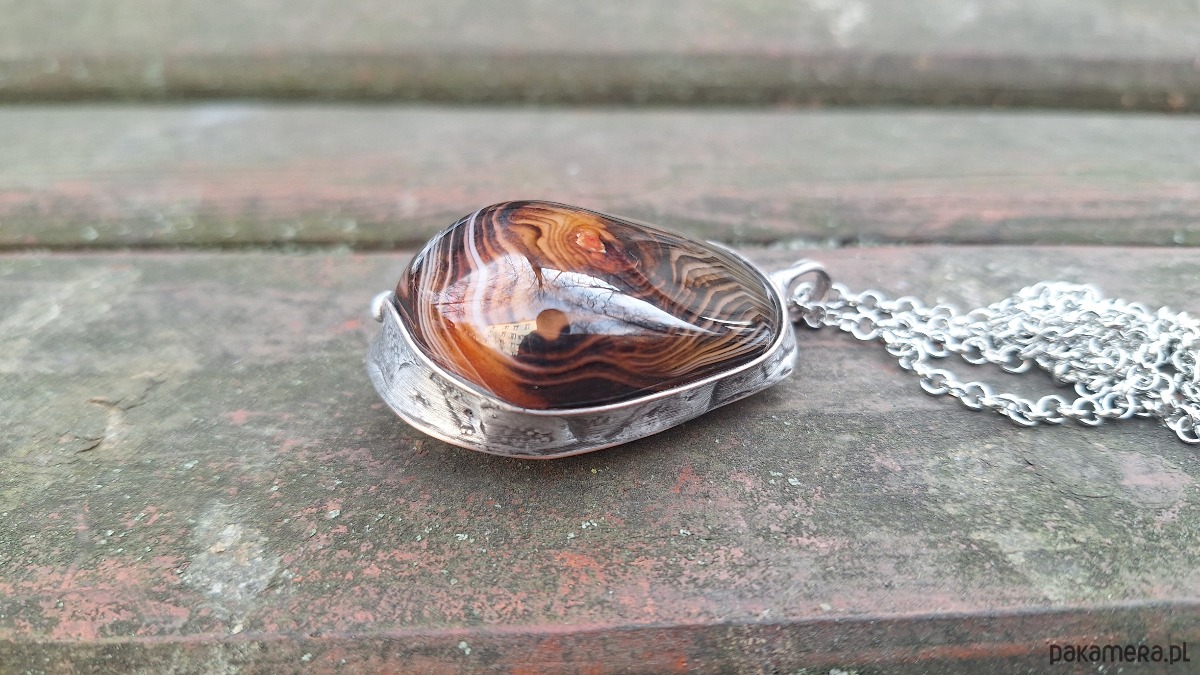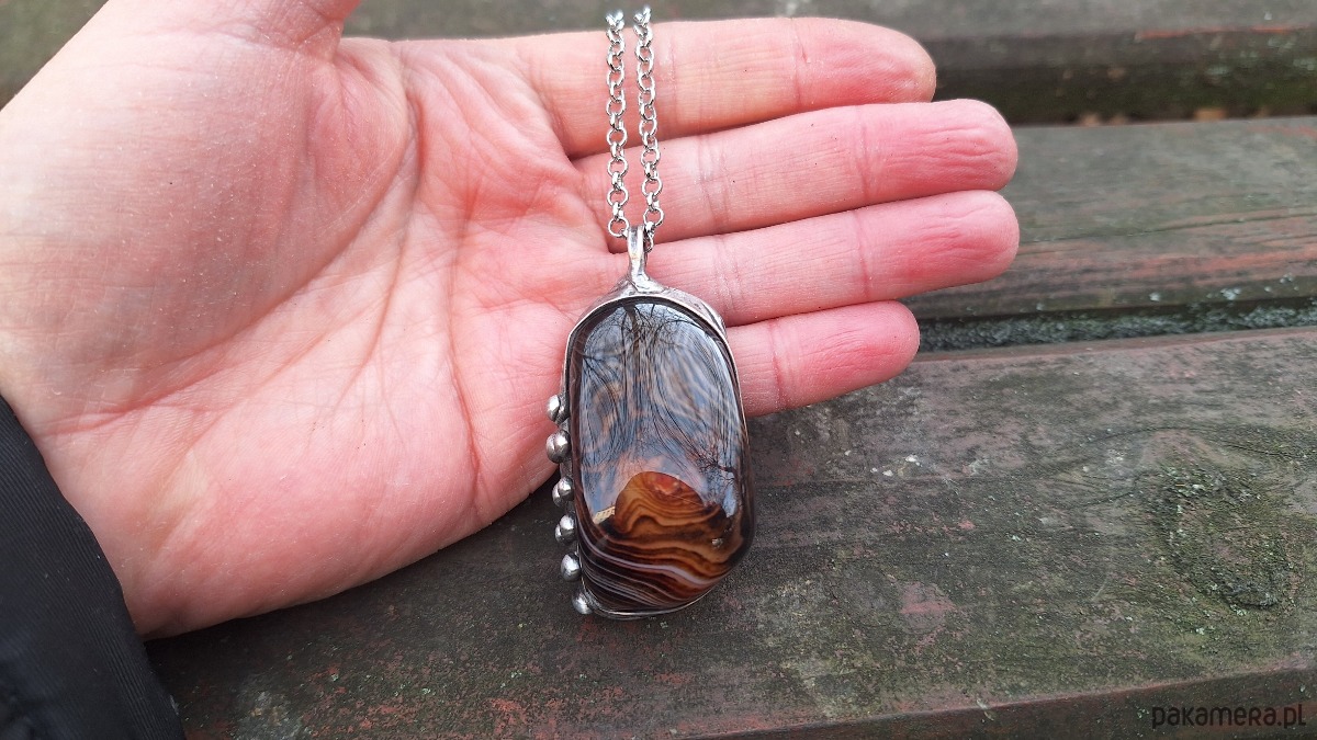 Wisiorek wykonany z miedzi, cyny i agatu. Wymiary ok. 5.5 na 2.7 cm. Zawieszony na łańcuszku o długości ok. 50 cm.