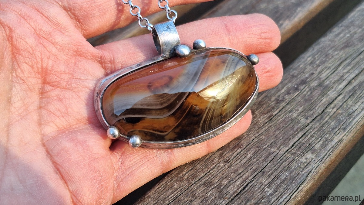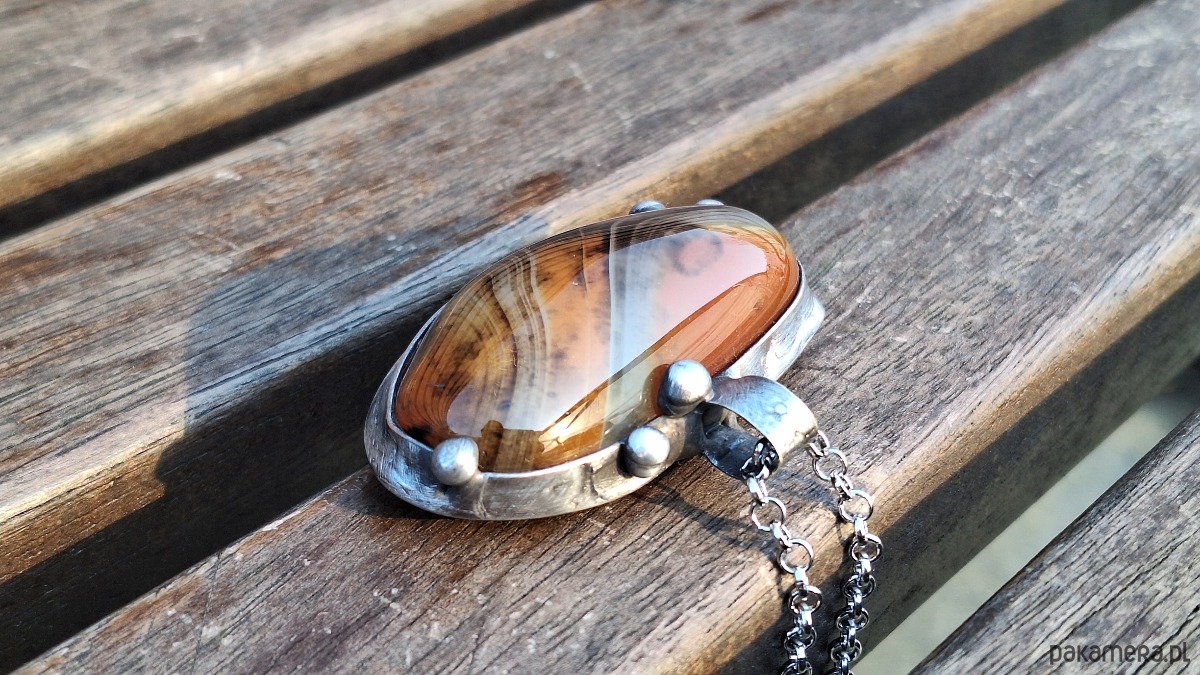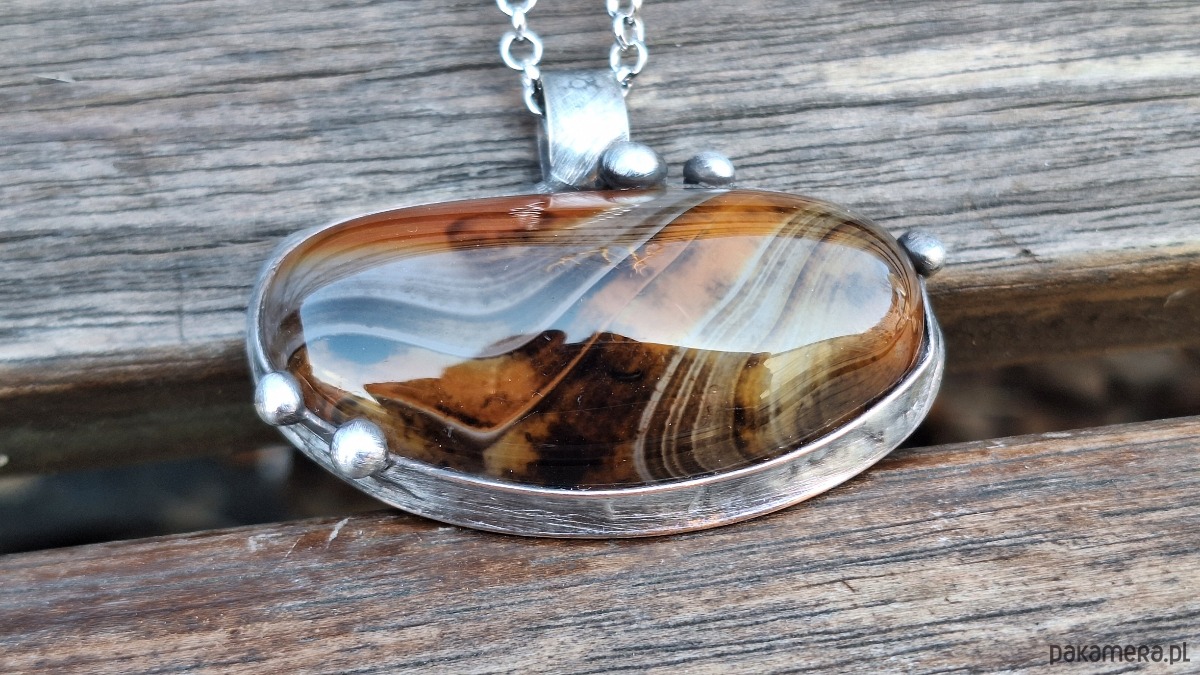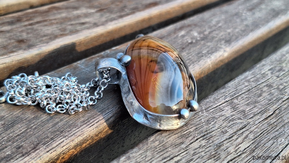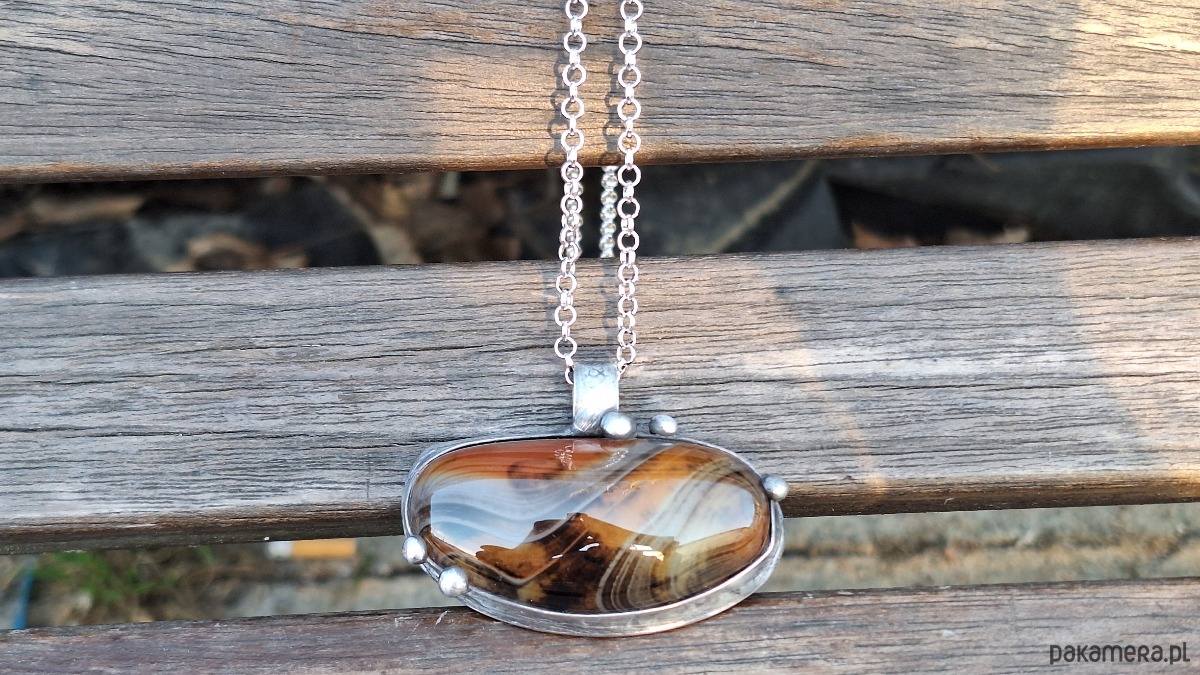 Wisiorek wykonany z miedzi, cyny i agatu. Wymiary ok. 6 na 3 cm. Zawieszony na łańcuszku o długości ok. 50 cm.