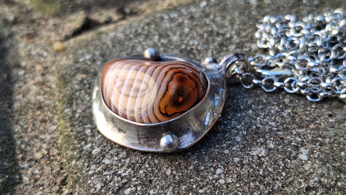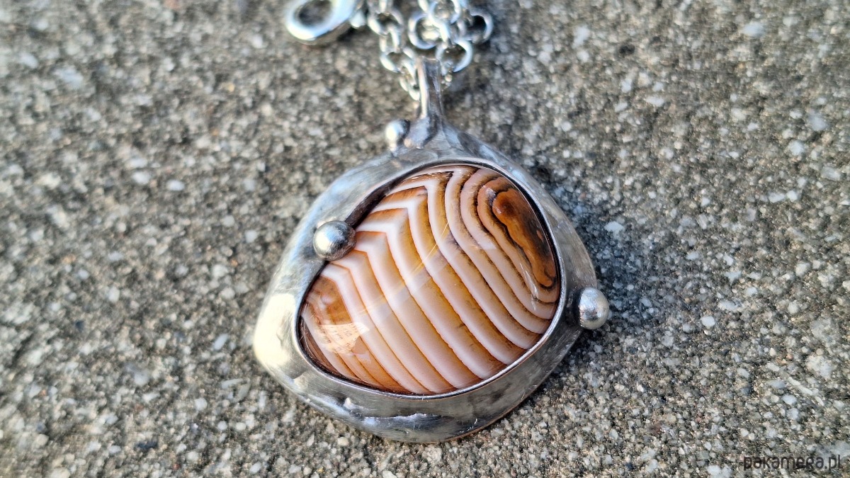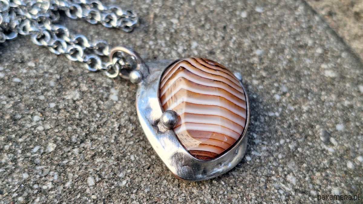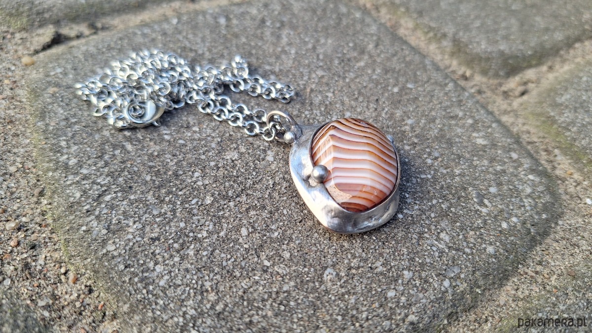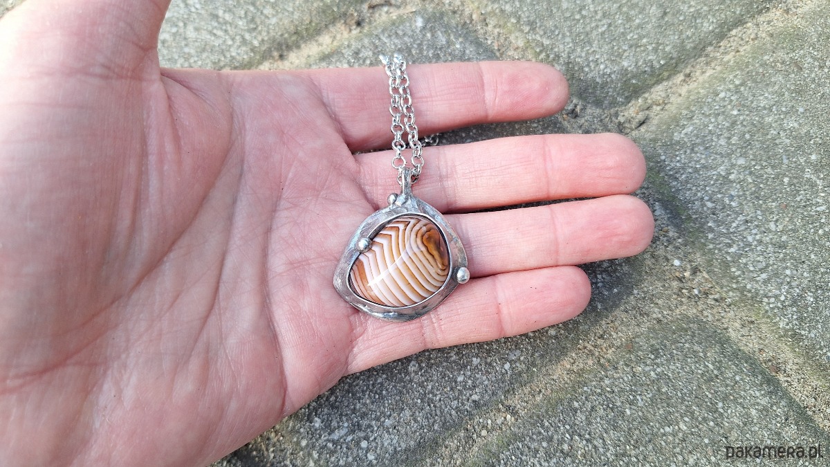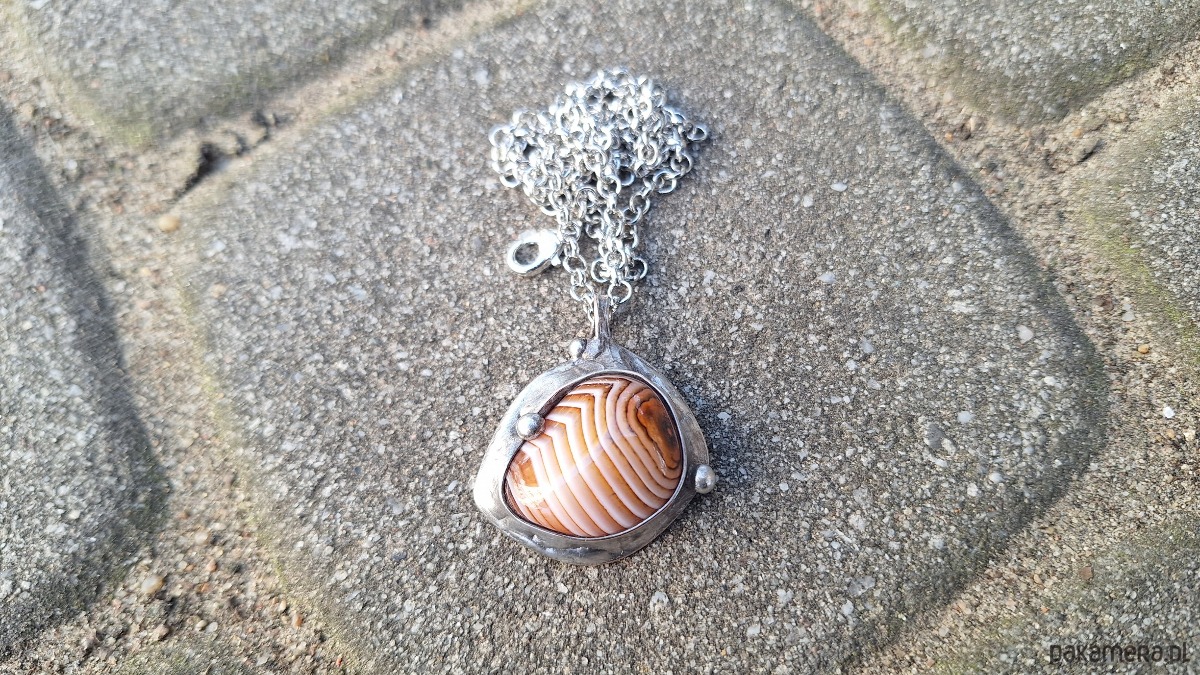 Wisiorek wykonany z miedzi, cyny i agatu. Wymiary ok. 3 na 3 cm. Zawieszony na łańcuszku o długości ok. 50 cm.
